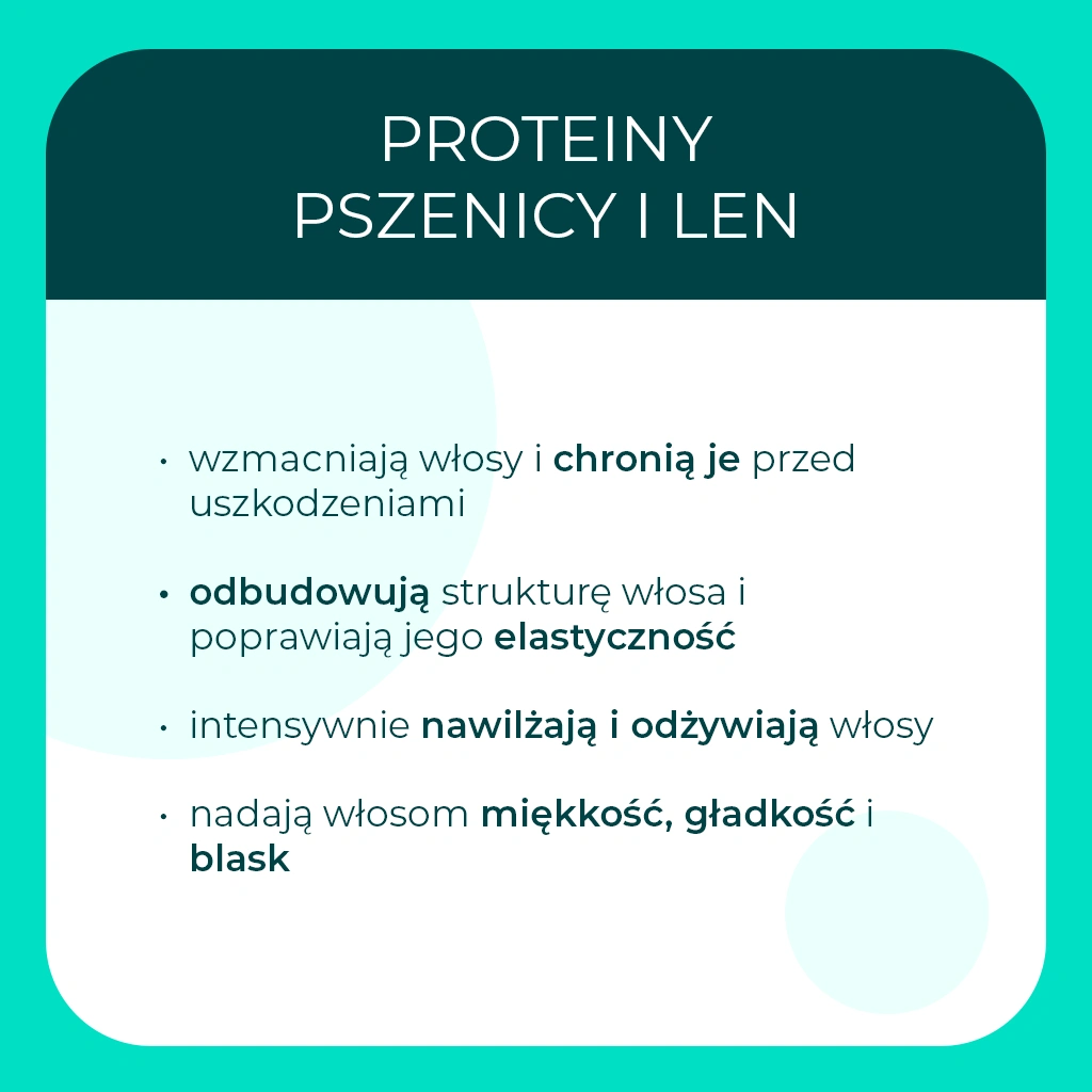 Hydrolizowane proteiny pszenicy wspierają odbudowę struktury włosa, uzupełniając mikrouszkodzenia. Ekstrakt z siemienia lnianego wygładza włosy i wzmacnia ich naturalną warstwę ochronną. Dzięki temu włosy stają się mocniejsze, bardziej odporne na łamanie i działanie czynników zewnętrznych. To szczególnie ważne dla włosów osłabionych stylizacją, farbowaniem lub częstym suszeniem.