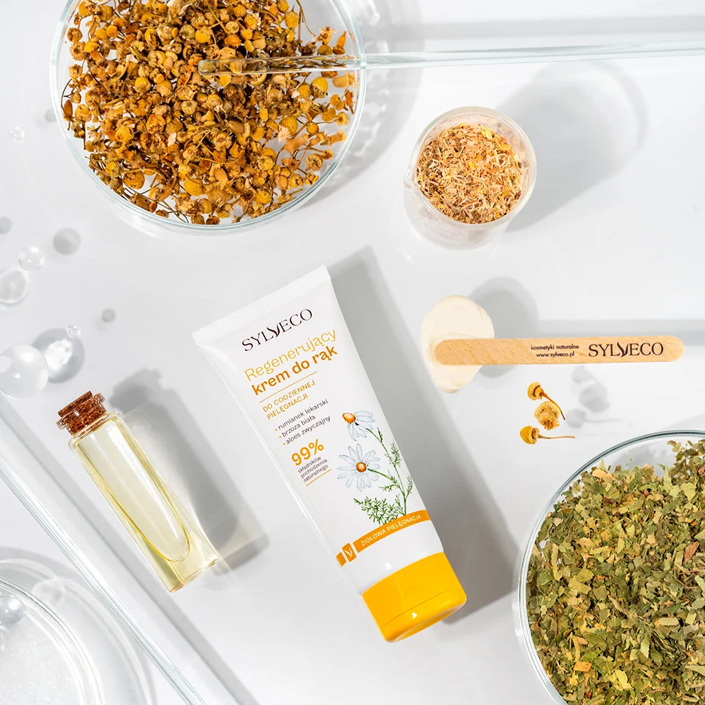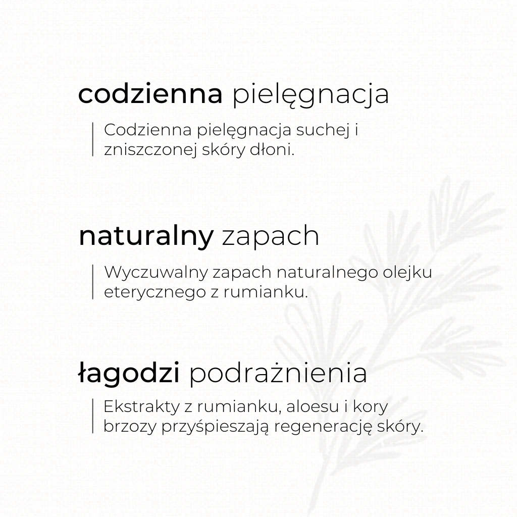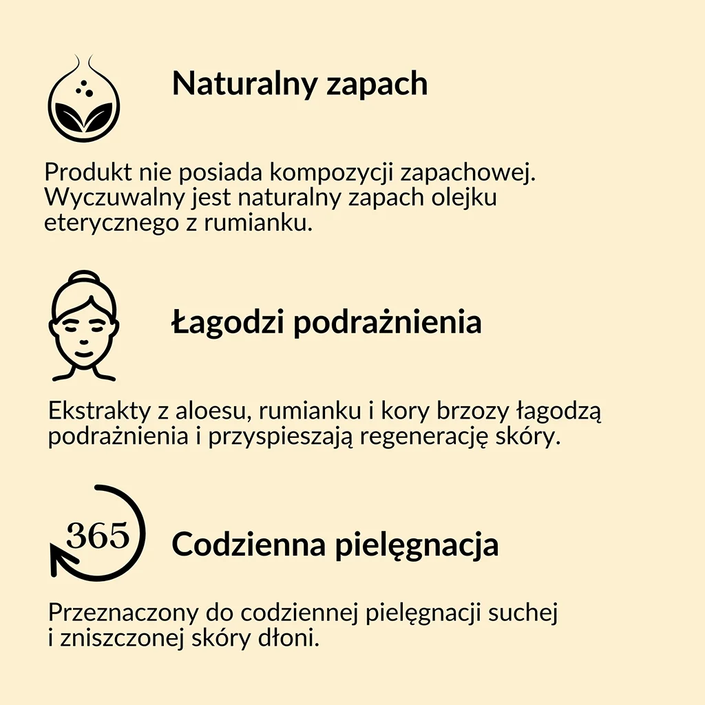 Naturalny krem regenerujący do rąk, stworzony wyłącznie z naturalnych składników, jest idealny do codziennej pielęgnacji skóry suchej i zniszczonej. Zapewnia intensywne nawilżenie i odżywienie, przywracając dłoniom gładkość, elastyczność i miękkość. Formuła kremu opiera się na roślinnych ekstraktach z rumianku, brzozy oraz aloesu, które oferują ochronę, działają łagodząco oraz wspierają naturalne procesy regeneracji skóry.