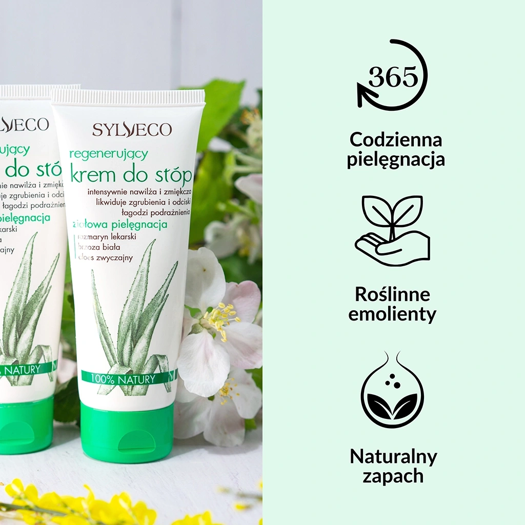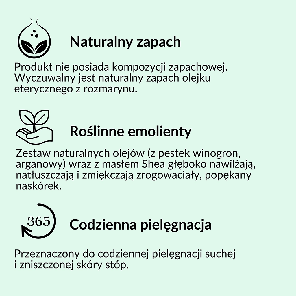 Naturalny, regenerujący krem do stóp, zawierający tylko naturalne składniki, przeznaczony jest do codziennej pielęgnacji suchej i zniszczonej skóry. Intensywnie i głęboko nawilża, natłuszcza i zmiękcza zrogowaciały, popękany naskórek. W skład kremu wchodzą roślinne ekstrakty aloesu oraz brzozy, które łagodzą podrażnienia, a olejek rozmarynowy działa kojąco i odświeża skórę.