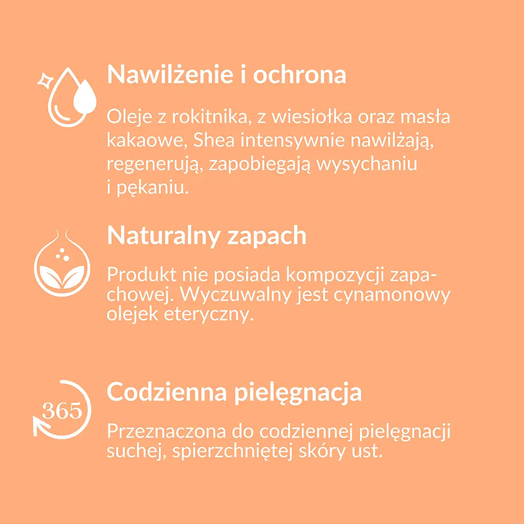 Naturalna pomadka ochronna do ust o zapachu cynamonu. Zapobiega wysychaniu i pękaniu ust, skutecznie chroni i regeneruje, pozostawiając usta miękkie i wygładzone.