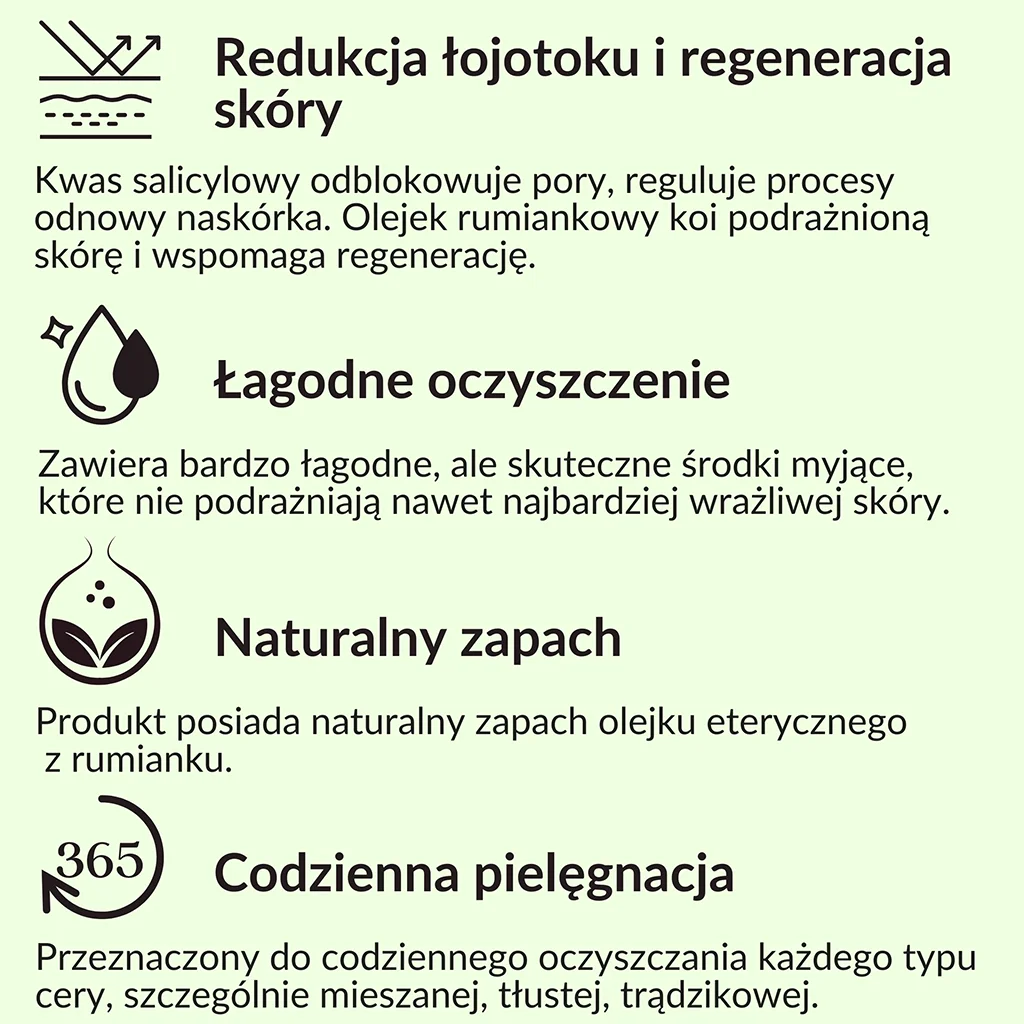 Naturalny, głęboko oczyszczający żel do mycia twarzy z kwasem salicylowym (2%) o aktywnym działaniu kojącym i łagodzącym. Zawiera bardzo łagodny, ale jednocześnie skuteczny środek myjący, który nie podrażnia nawet najbardziej wrażliwej skóry. Usuwa zanieczyszczenia i nadmiar sebum, odblokowuje pory i reguluje procesy odnowy naskórka. Żel został wzbogacony olejkiem eterycznym z rumianku, który posiada właściwości regenerujące i łagodzące. Systematyczne stosowanie pozwala zachować gładką, miękką, zdrową skórę.