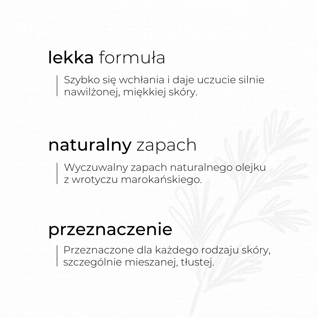 Produkt posiada przyjemny, naturalny, ziołowy zapach olejku eterycznego z wrotyczu marokańskiego, który sprawi, że Twoja codzienna pielęgnacja stanie się jeszcze przyjemniejsza.