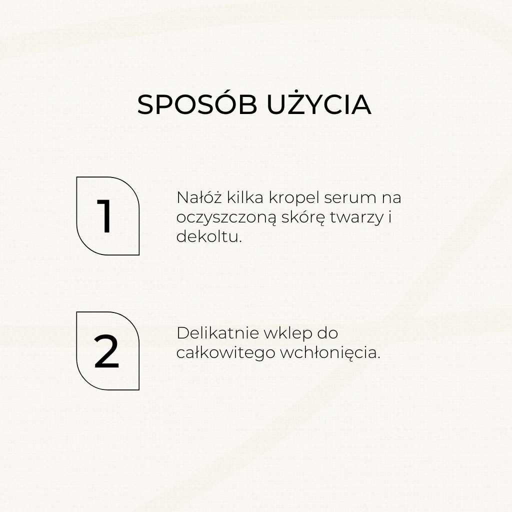 | Sposób użycia | delikatnie wklepując w skórę twarzy, najlepiej wieczorem, Nanieść 3-5 kropel na czystą skórę, szyi i dekoltu. Najlepsze efekty uzyskuje się stosując serum na jeszcze lekko wilgotną skórę, tuż po aplikacji toniku lub hydrolatu. |