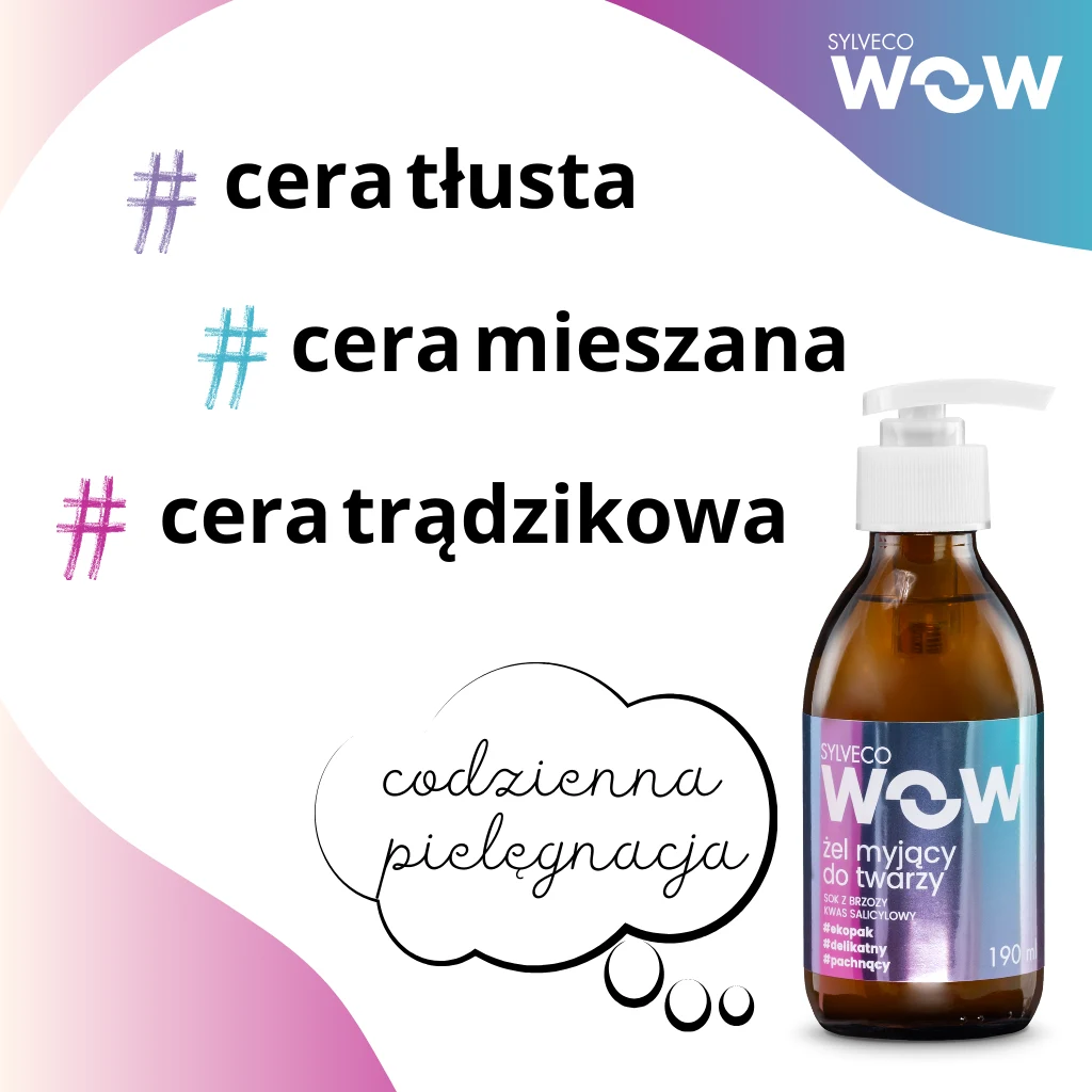 Delikatny żel do mycia twarzy SYLVECO WOW, stworzony z myślą o codziennej higienie nastoletniej, zanieczyszczonej cery z problemami takimi jak zmiany trądzikowe czy rozszerzone pory. Zapewnia skuteczne oczyszczanie bez ryzyka podrażnień, normalizuje produkcję sebum i pozostawia skórę miękką oraz gładką.