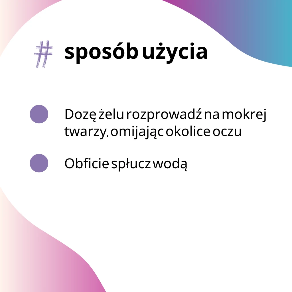 Sposób użycia | Dozę żelu rozprowadzić na mokrej twarzy, omijając okolice oczu. Obficie spłukać wodą. Stonizować cerę za pomocą toniku, a następnie nałożyć krem. |