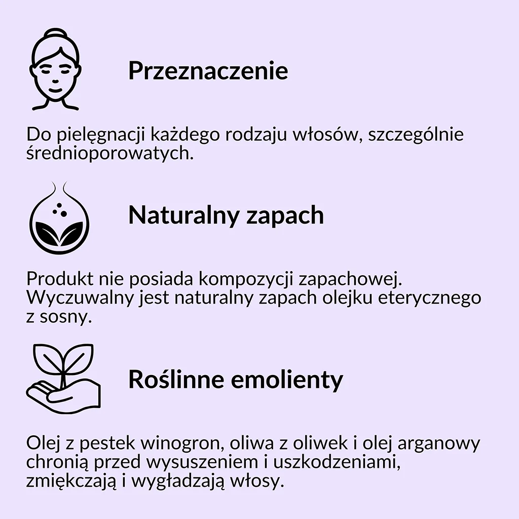 Odżywka została stworzona z myślą o każdym rodzaju włosów, zwłaszcza tych średnioporowatych. Tajemnica naszej odżywki tkwi w roślinnych emolientach, takich jak olej z pestek winogron, oliwa z oliwek i olej arganowy, które stanowią tarczę dla Twoich włosów, chroniąc je przed wysuszeniem i uszkodzeniami. Dodatkowo, te wyjątkowe składniki zmiękczają i wygładzają włosy, dodając im blasku.