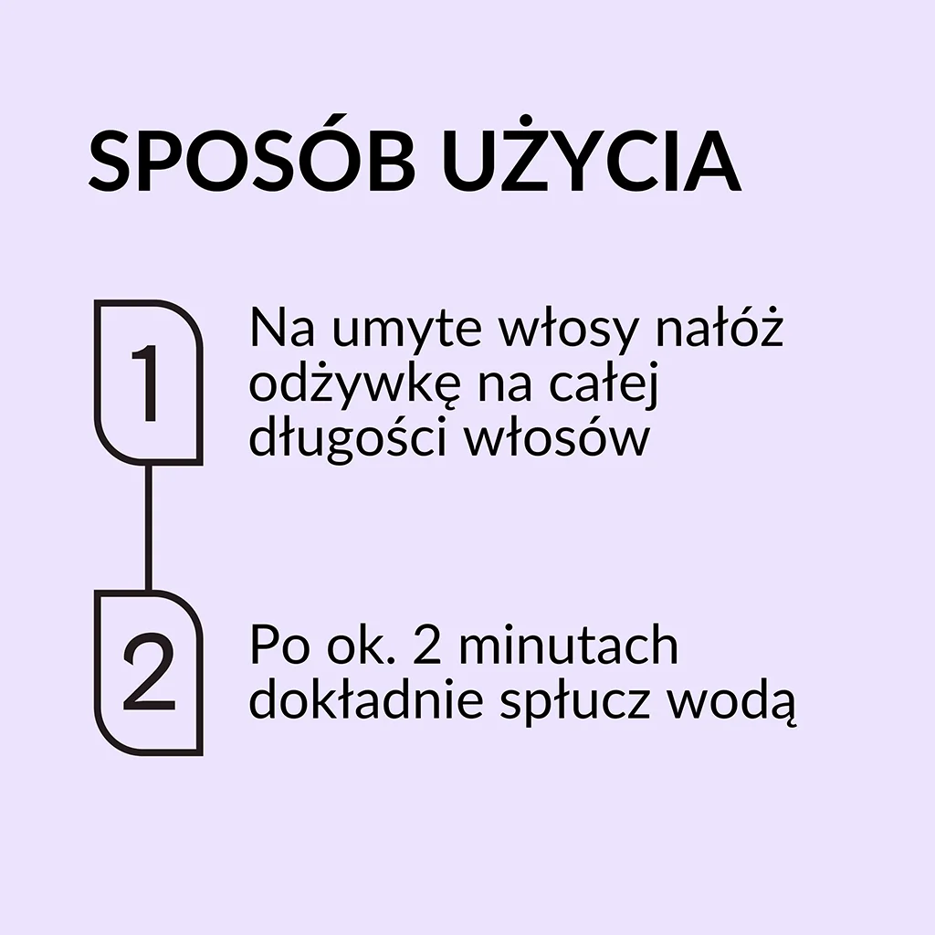Na umyte włosy nałożyć odżywkę na całej długości włosów na ok. 2 minuty i dokładnie spłukać. Można dodatkowo wmasować odżywkę w skórę głowy, aby wzmocnić cebulki włosów. Stosować po każdym myciu.