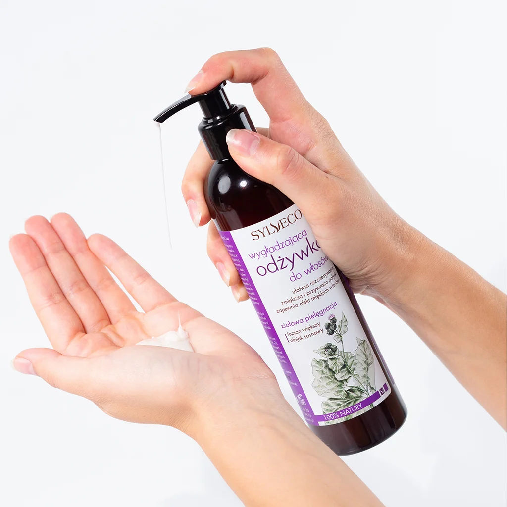 Wygładzająca odżywka na bazie ekstraktu z łopianu przeznaczona jest do każdego rodzaju włosów. Zawiera składniki wzmacniające, nawilżające i odbudowujące, dzięki którym włosy nabierają blasku, ładnie się układają, są gładkie i elastyczne. Olej z pestek winogron, oliwa z oliwek i olej arganowy chronią przed wysuszeniem i uszkodzeniami. Dodatkowo cukier i panthenol (humektanty) zatrzymują wilgoć i pozwalają uzyskać odpowiednią objętość fryzury, bez obciążenia. Stosowanie odżywki po każdym myciu włosów zapewnia efekt idealnie miękkich, wygładzonych i pełnych blasku włosów.