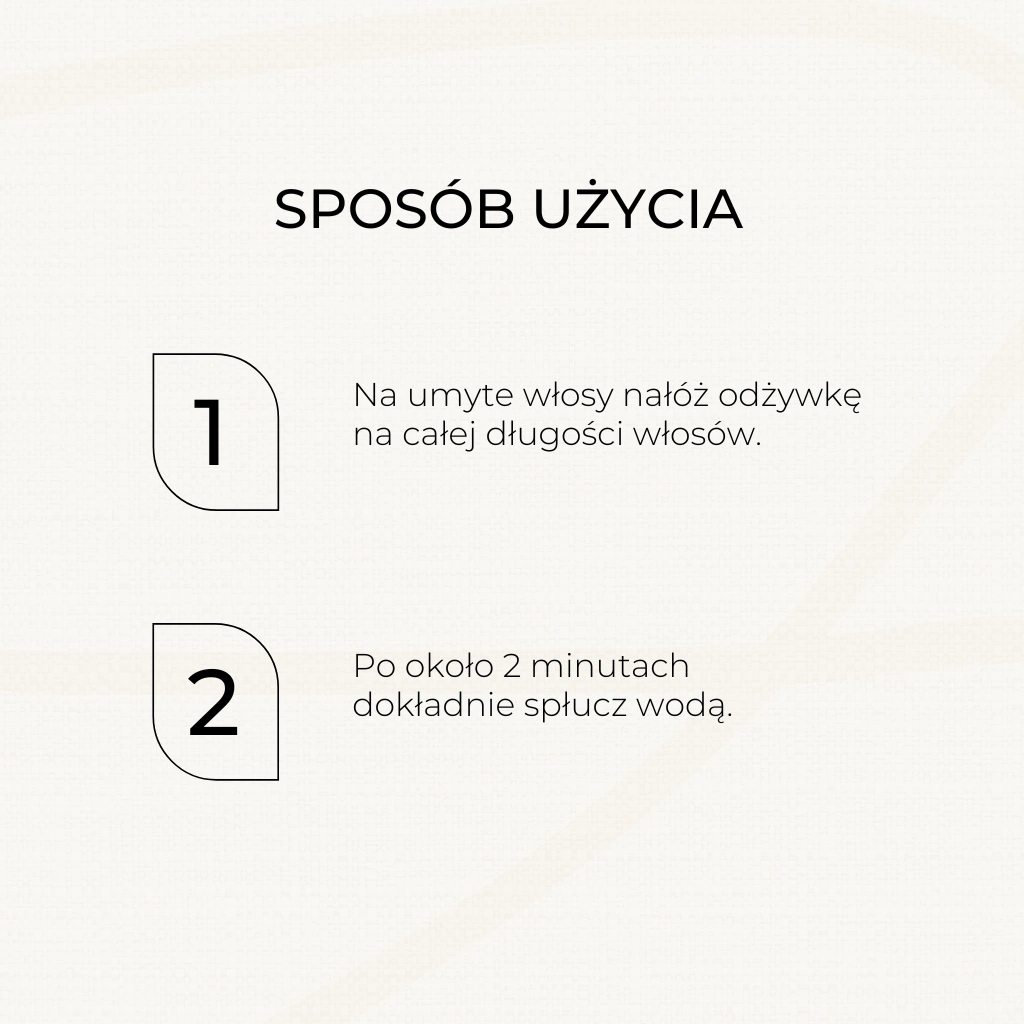 | Sposób użycia | Na umyte włosy nałożyć odżywkę na całej długości włosów na ok. 2 minuty i dokładnie spłukać. Można dodatkowo wmasować odżywkę w skórę głowy, aby wzmocnić cebulki włosów. Stosować po każdym myciu. |