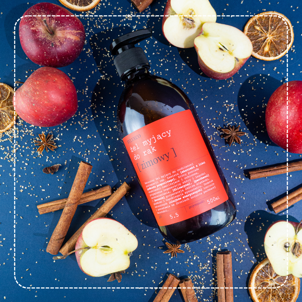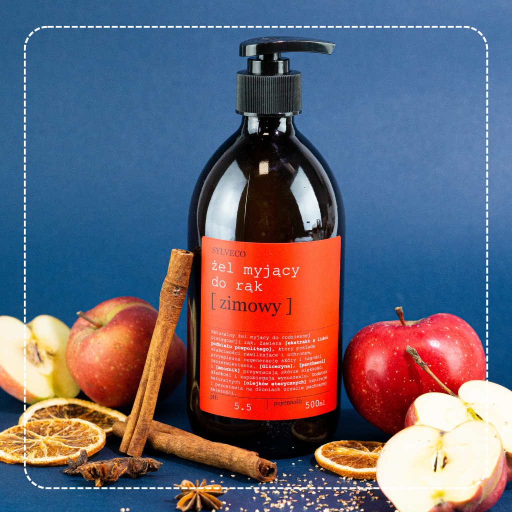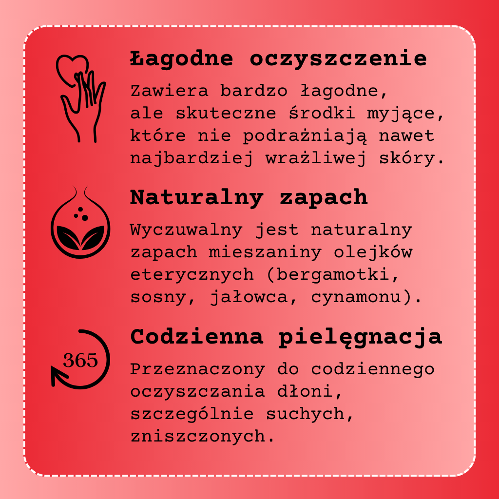 Skład INCI | Aqua, Cinnamal, Cinnamomum Zeylanicum Bark Oil, Cinnamomum Zeylanicum Leaf Oil, Citrus Aurantium Bergamia Peel Oil, Cocamidopropyl Betaine, Coco-Glucoside, Cyamopsis Tetragonoloba Gum, Eugenol, Glycerin, Juniperus Communis Fruit Oil, Lactic Acid, Lauryl Glucoside, Limonene, Linalool, Panthenol, Pinus Sylvestris Leaf Oil, Sodium Benzoate, Tussilago Farfara Leaf Extract, Urea |