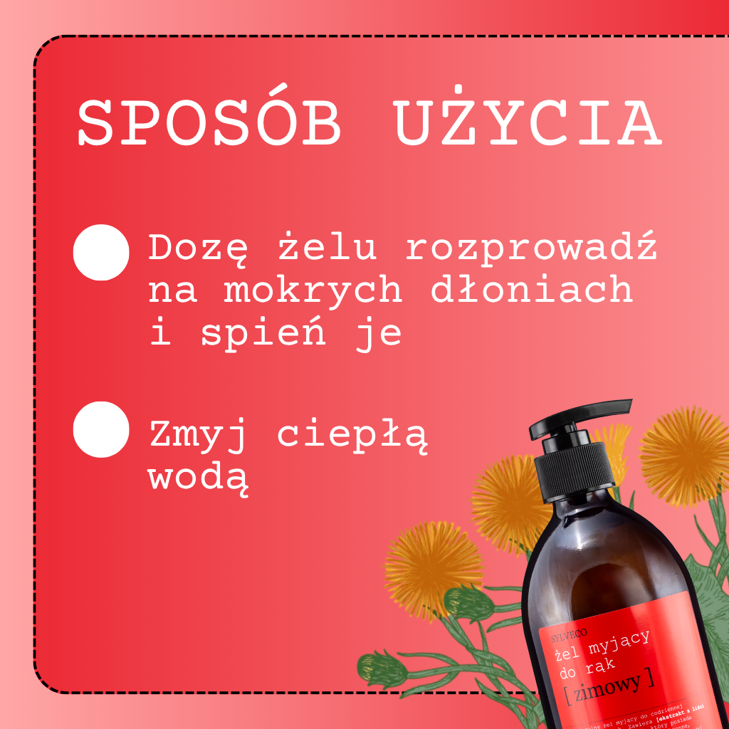 Sposób użycia | Dozę żelu rozprowadzić na mokrych dłoniach, spienić i zmyć ciepłą wodą. Po każdym myciu zaleca się aplikację odpowiedniego kremu do rąk. |