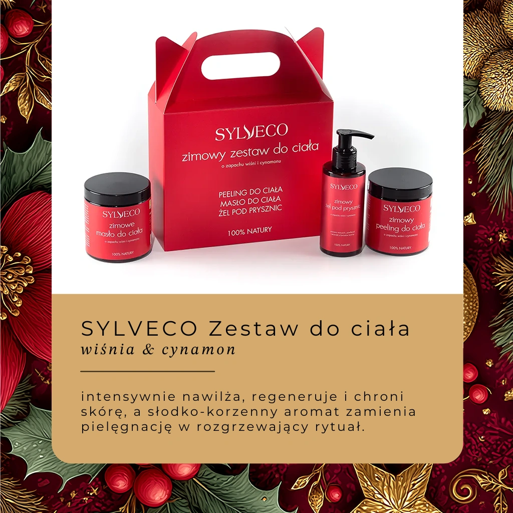 Zestaw czerwonych kosmetyków do ciała SYLVECO to zaproszenie do przytulnego, ciepłego, domowego SPA w zimowe wieczory. Zmysłowy zapach wiśni i cynamonu otula skórę niczym miękki, rozgrzewający koc, przynosząc ukojenie w chłodne, pochmurne dni. Idealny na prezent dla każdej kobiety, która pragnie wprowadzić świąteczny klimat do codziennej pielęgnacji.
