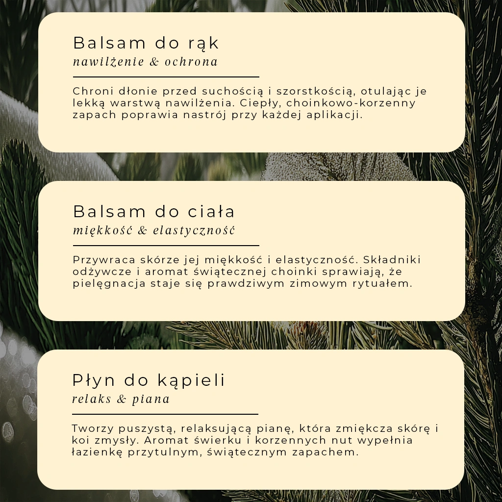 Leśny zapach to doskonały pomysł na zimowy upominek. W komplecie znajdziesz płyn do kąpieli, balsam do ciała i balsam do rąk, które otulają skórę aromatem sosny, jałowca, bergamotki i cynamonu. To trzy produkty, które zapewnią Ci chwilę odprężenia i bliskości z naturą – idealne zarówno dla Ciebie, jak i dla kogoś wyjątkowego./p>