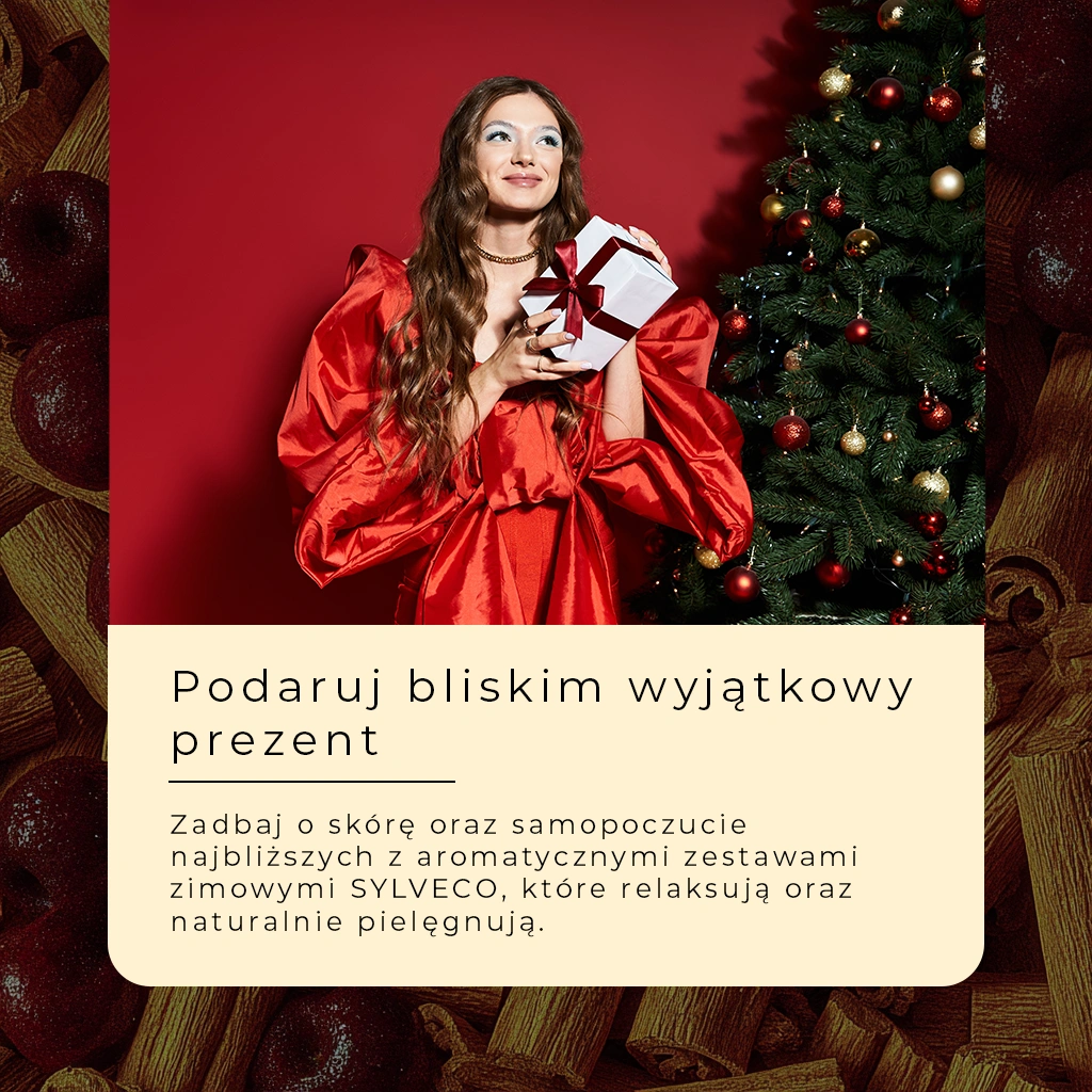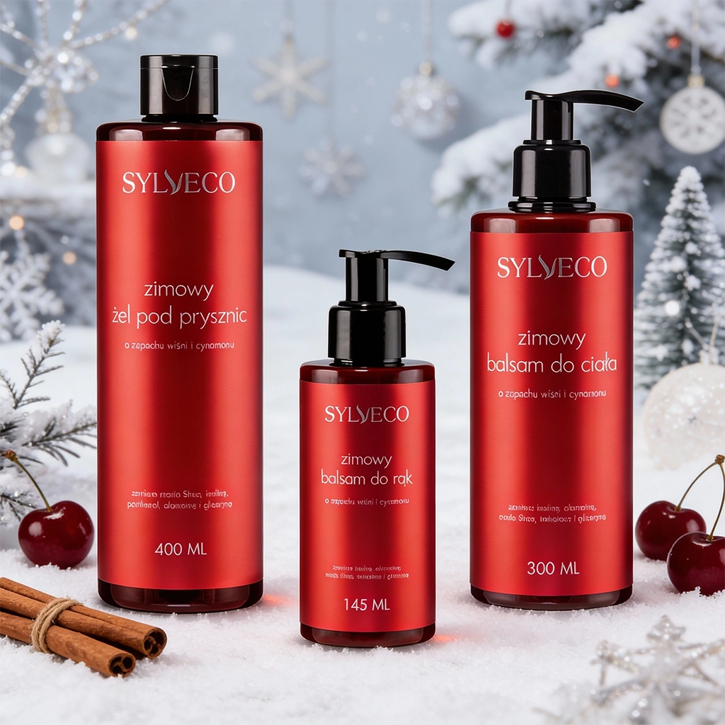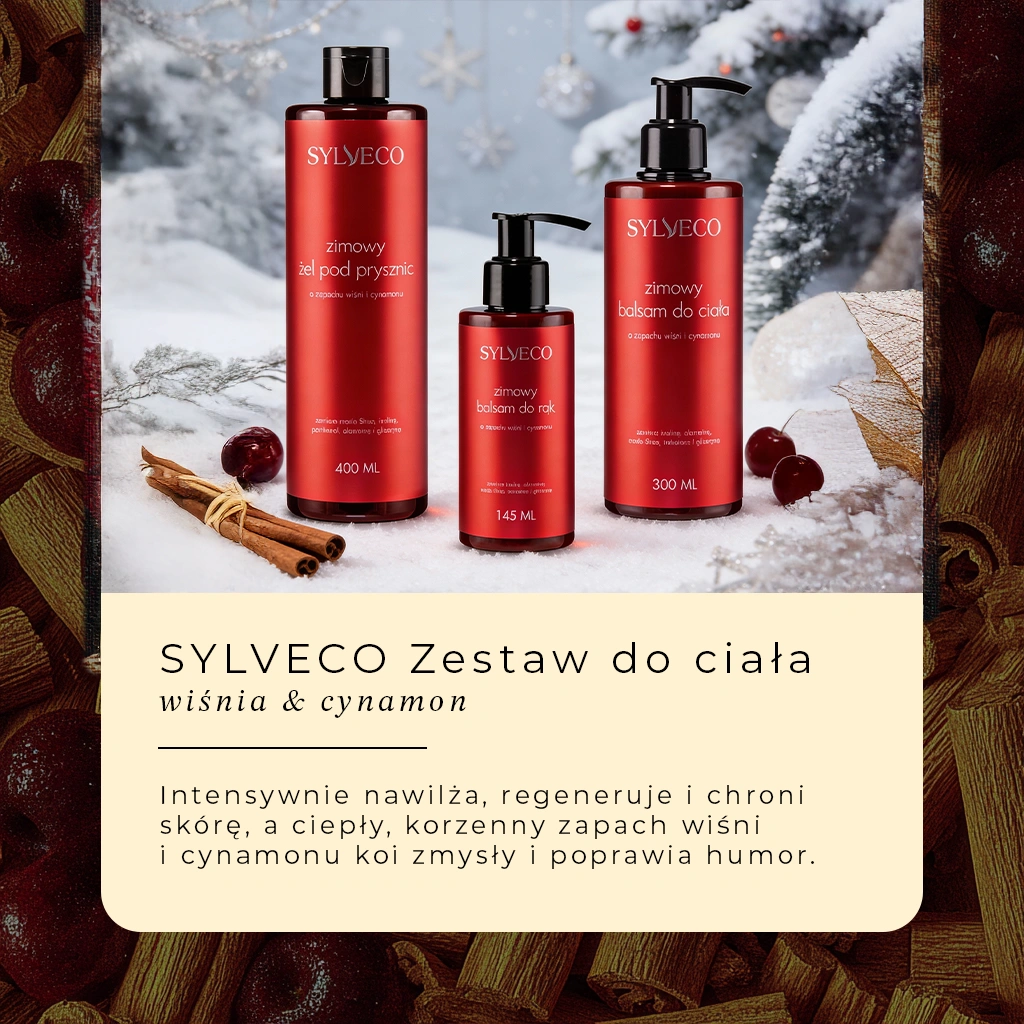 Zimowy zestaw SYLVECO o zapachu wiśni i cynamonu to doskonały pomysł na prezent. Słodko-korzenny aromat, naturalne składniki i elegancka zimowa estetyka sprawiają, że zestaw świetnie sprawdzi się jako świąteczny upominek lub miły gest dla samego siebie. Podaruj odrobinę ciepła i relaksu w chłodne dni.