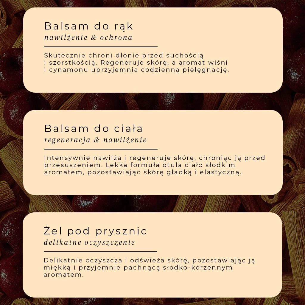 Zestaw urzeka aromatem, który łączy słodycz soczystej wiśni z ciepłem korzennego cynamonu. Ten wyjątkowy duet przywołuje wspomnienie zimowych wieczorów, rozgrzewających napojów i domowego ciepła. Zapach otula zmysły, wprowadza w błogi nastrój i sprawia, że pielęgnacja staje się chwilą przyjemności.