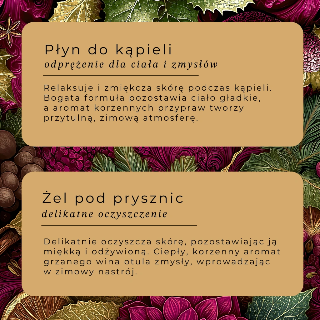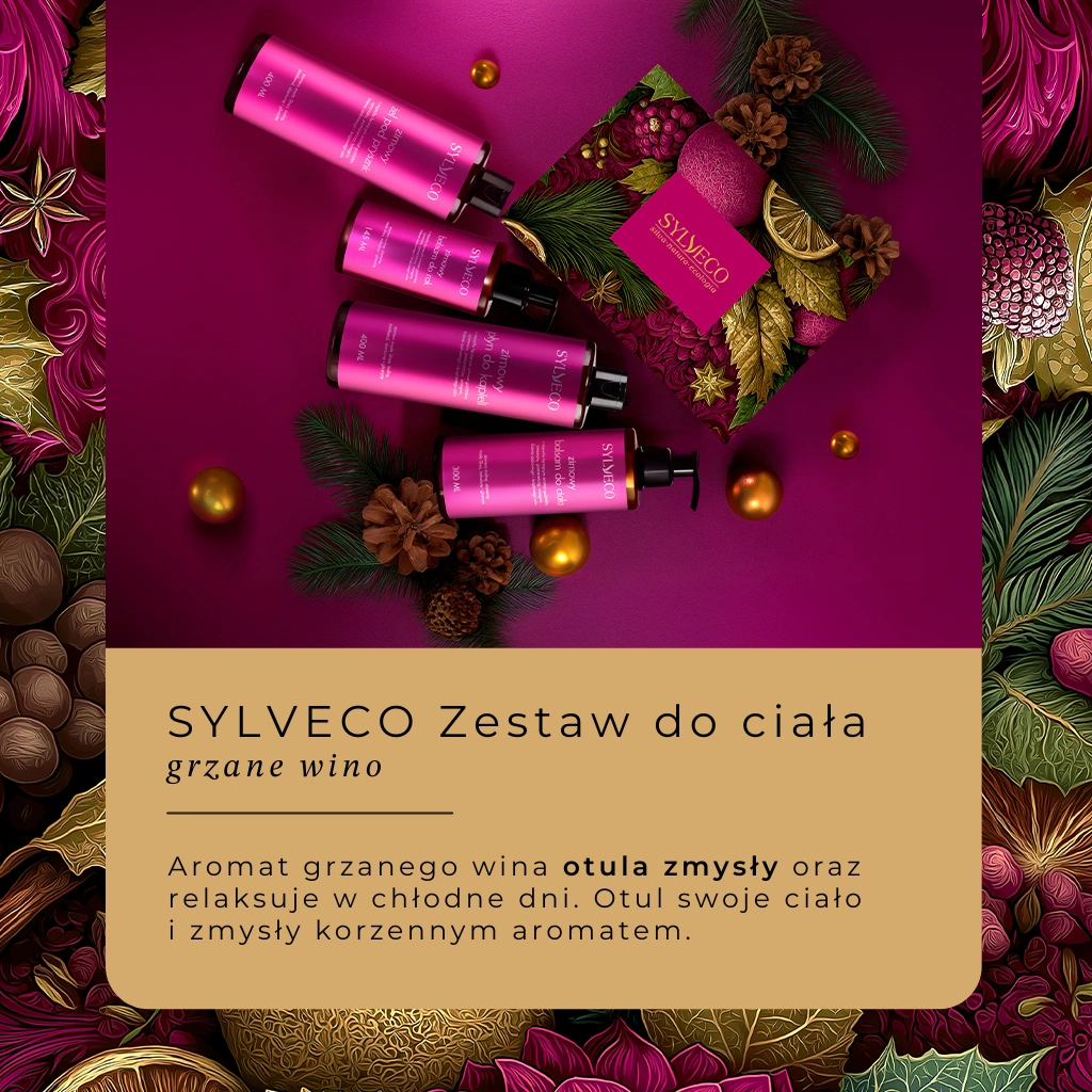 Zestaw SYLVECO o zapachu grzanego wina zapewnia pielęgnację na każdym etapie: żel pod prysznic delikatnie oczyszcza, płyn do kąpieli relaksuje i zmiękcza skórę, balsam do ciała intensywnie nawilża i regeneruje, a balsam do rąk chroni przed suchością. Razem tworzą harmonijny rytuał pielęgnacyjny, który dba o ciało i zmysły w sezonie zimowym.