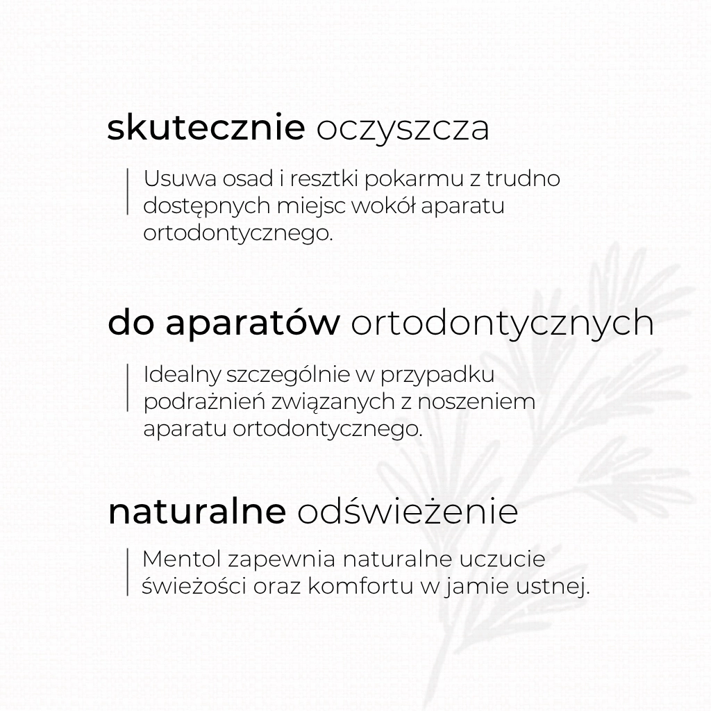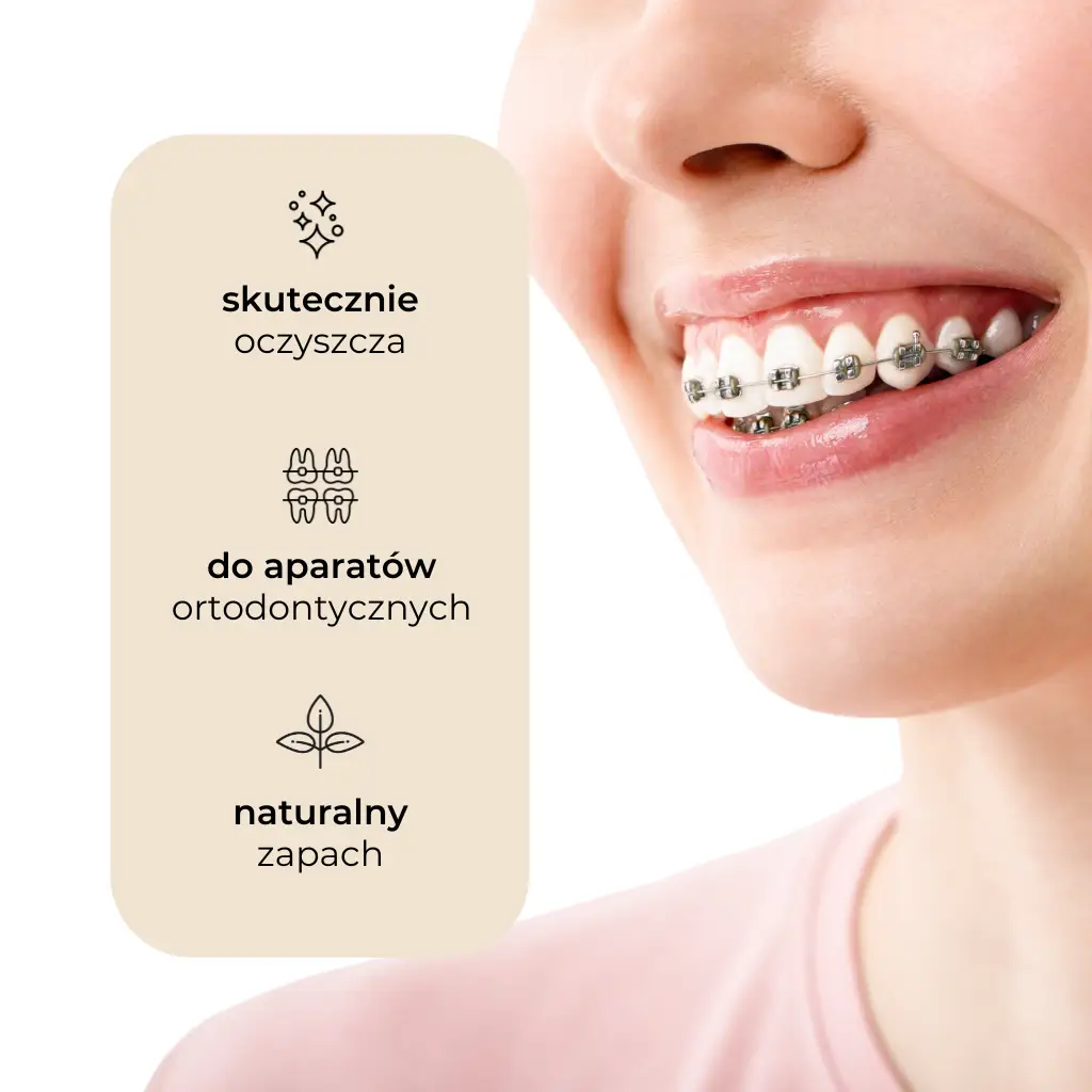 Ten produkt to praktyczny element rutyny higienicznej dla osób z aparatem: pomaga zadbać o świeżość, wspiera dziąsła i ułatwia utrzymanie czystości w miejscach, do których szczoteczka nie zawsze dociera idealnie.