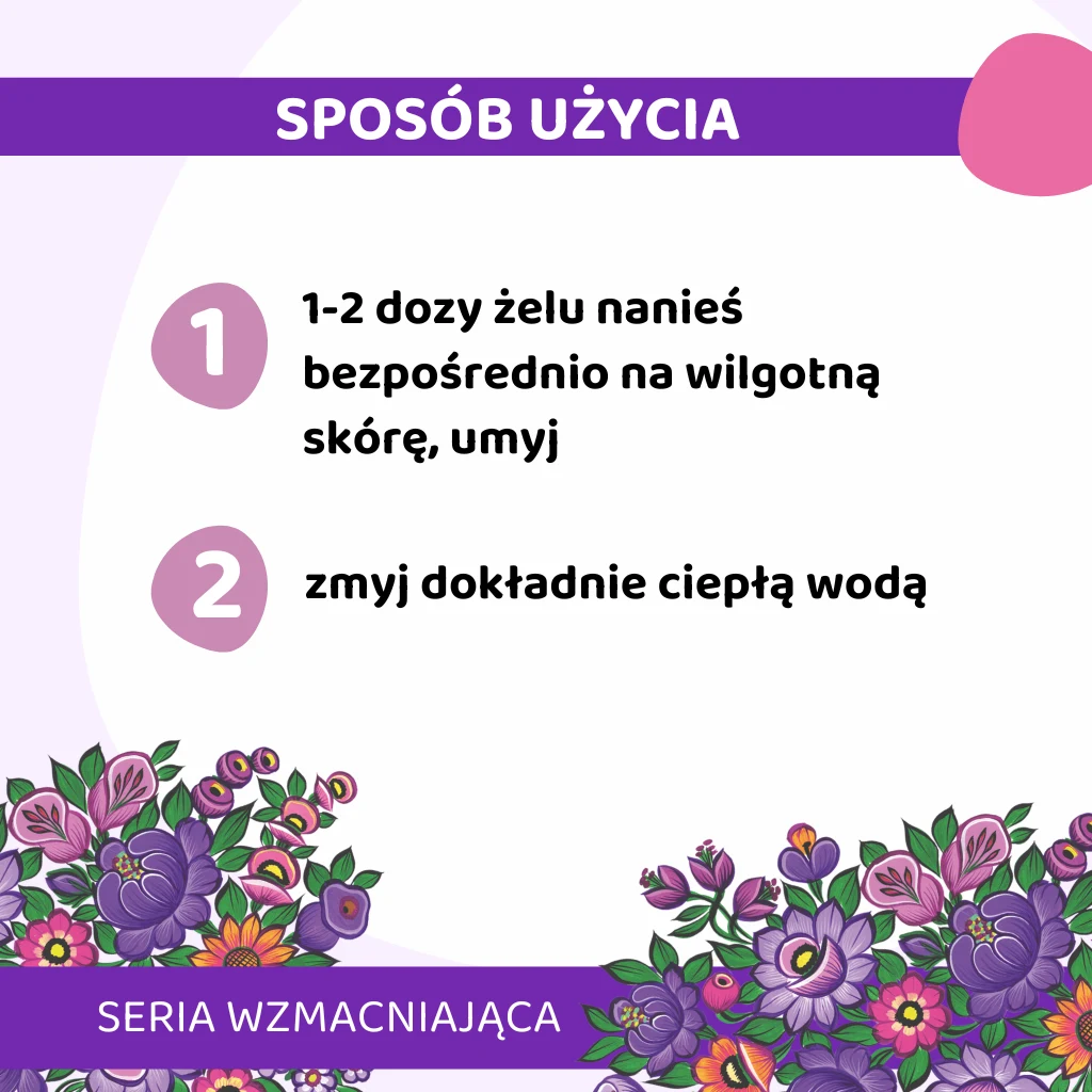 Żel skutecznie myje, nie naruszając naturalnej bariery hydrolipidowej, chroniącej przed szkodliwymi czynnikami zewnętrznymi. Zawarty w nim olejek rumiankowy koi i łagodzi podrażnienia. Żel nie powoduje uczucia pieczenia i ściągnięcia, dzięki czemu codzienna pielegnacja staje się prawdziwą przyjemnością.