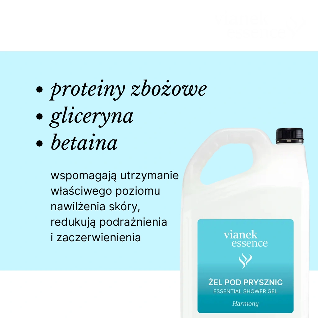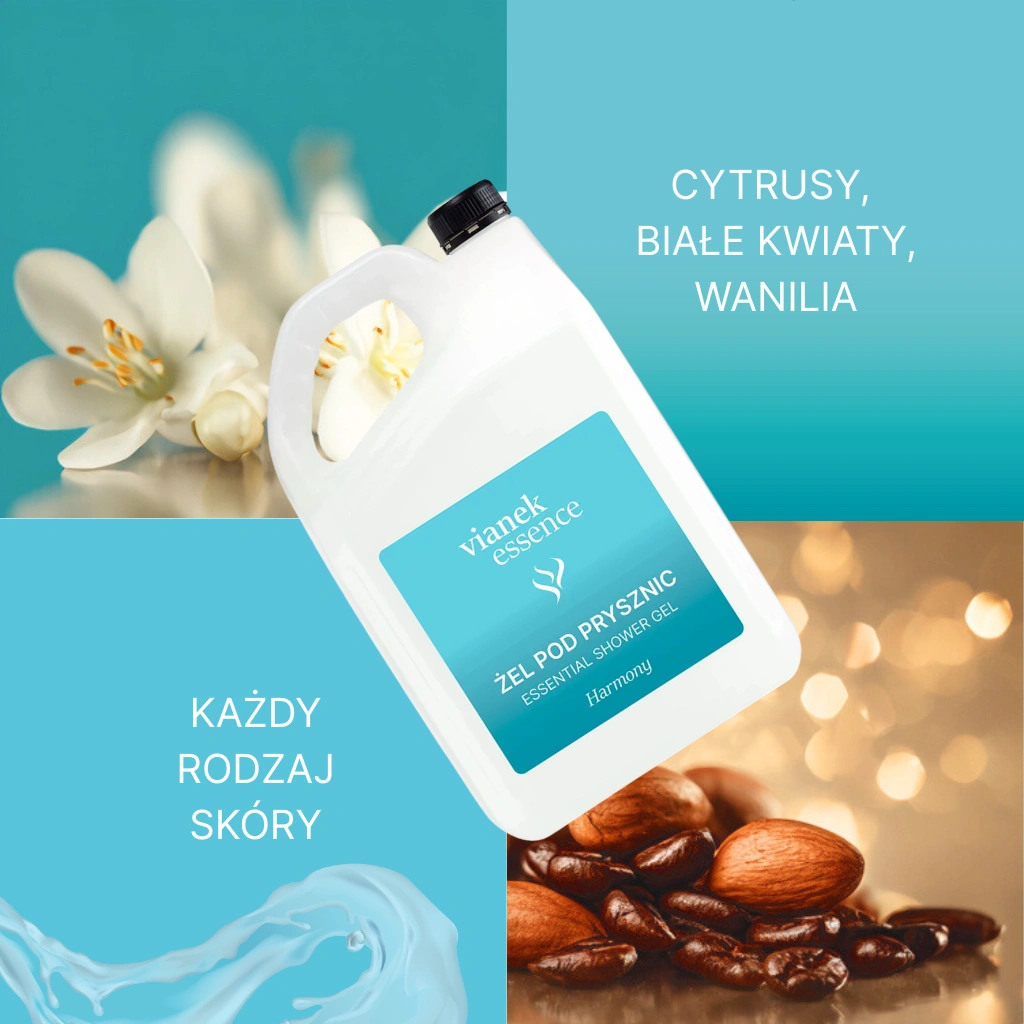Żel pod prysznic Harmony łagodnie oczyszcza skórę, pozostawiając ją miękką, gładką i odpowiednio nawilżoną. Dzięki zawartości protein roślinnych, betainy i gliceryny skutecznie odżywia, wspiera regenerację oraz pomaga redukować zaczerwienienia. Całość dopełnia subtelny aromat cytrusów, białych kwiatów i wanilii, który sprawia, że każda kąpiel staje się wyjątkowym, zmysłowym rytuałem