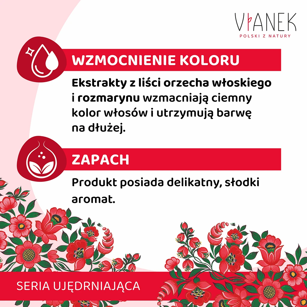 Chcesz zatrzymać intensywny, ciemny kolor włosów na dłużej? Maska zawiera ekstrakty z liści orzecha włoskiego i rozmarynu, które wzmacniają kolor i pozwalają zachować jego intensywność na dłużej.