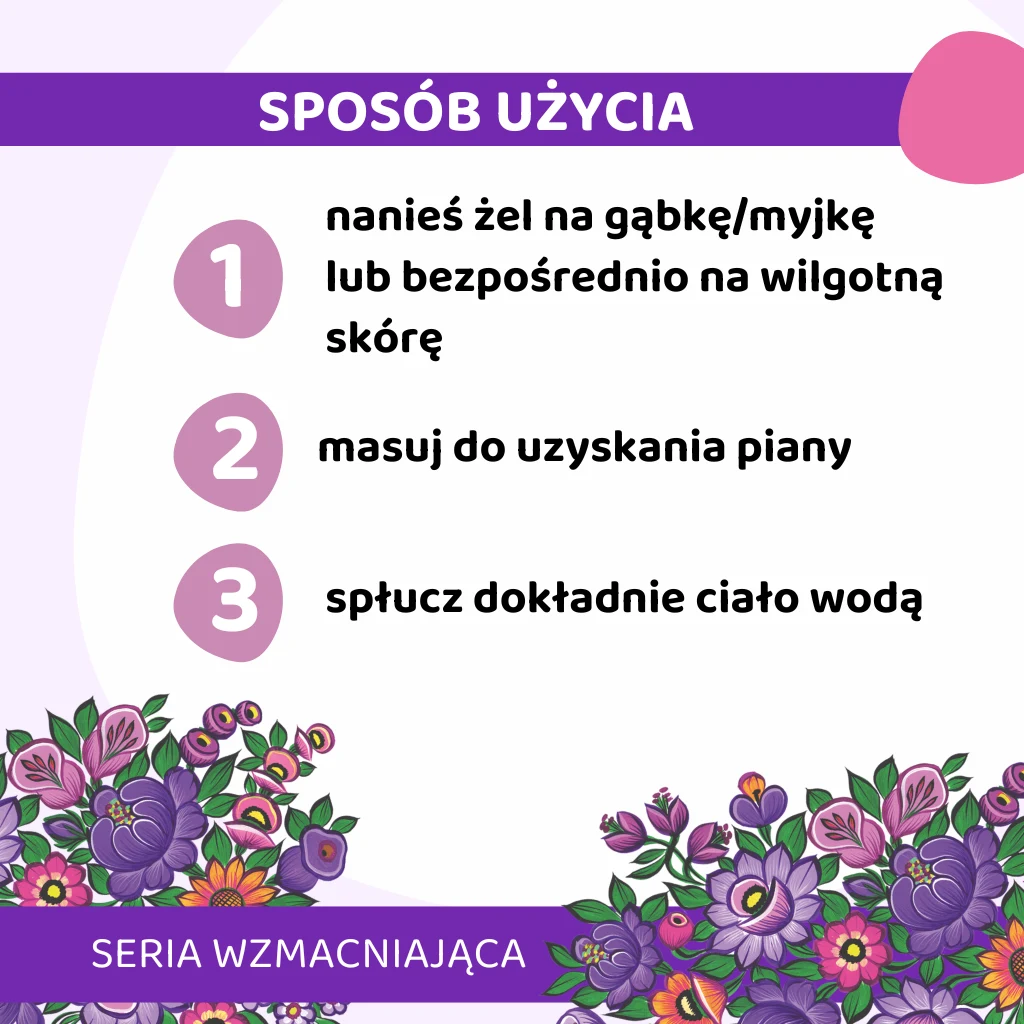 Sposób użycia | Nanieś żel na gąbkę/myjkę lub bezpośrednio na wilgotną skórę i masuj do uzyskania piany. Następnie spłucz dokładnie ciało wodą. |