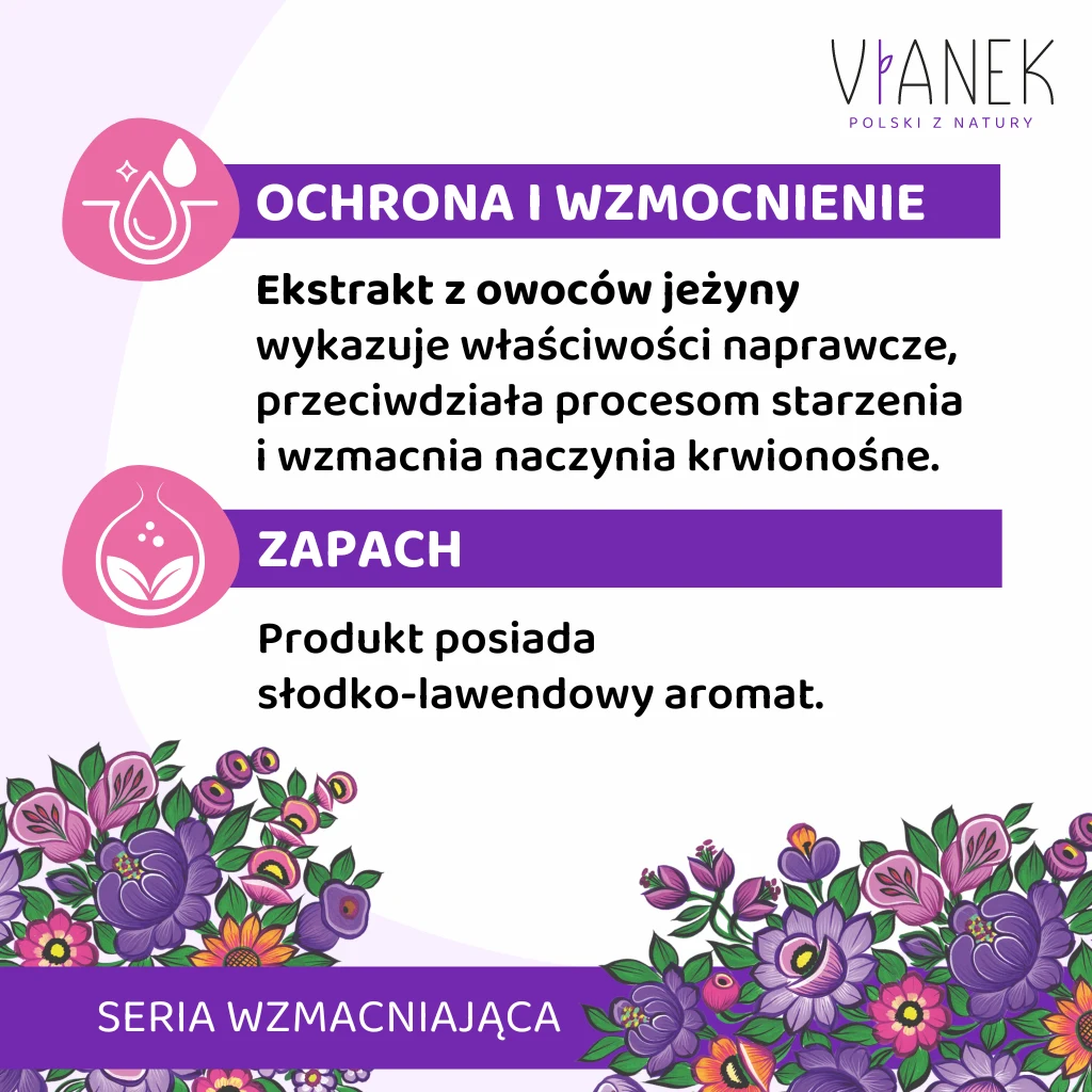 Żel pod prysznic na bazie łagodnych środków myjących delikatnie i skutecznie oczyszcza, nie podrażniając jednocześnie skóry wrażliwej i skłonnej do zaczerwienienia. Zawiera ekstrakt z owoców jeżyny o właściwościach antyoksydacyjnych i wzmacniających. Kompleks składników nawilżających i kojących (skwalan, alantoina, panthenol) gwarantuje zwiększenie nawilżenia i poprawę kondycji skóry. Dzięki olejkowi lawendowemu kąpiel odpręża i pozostawia ciało w stanie relaksu.