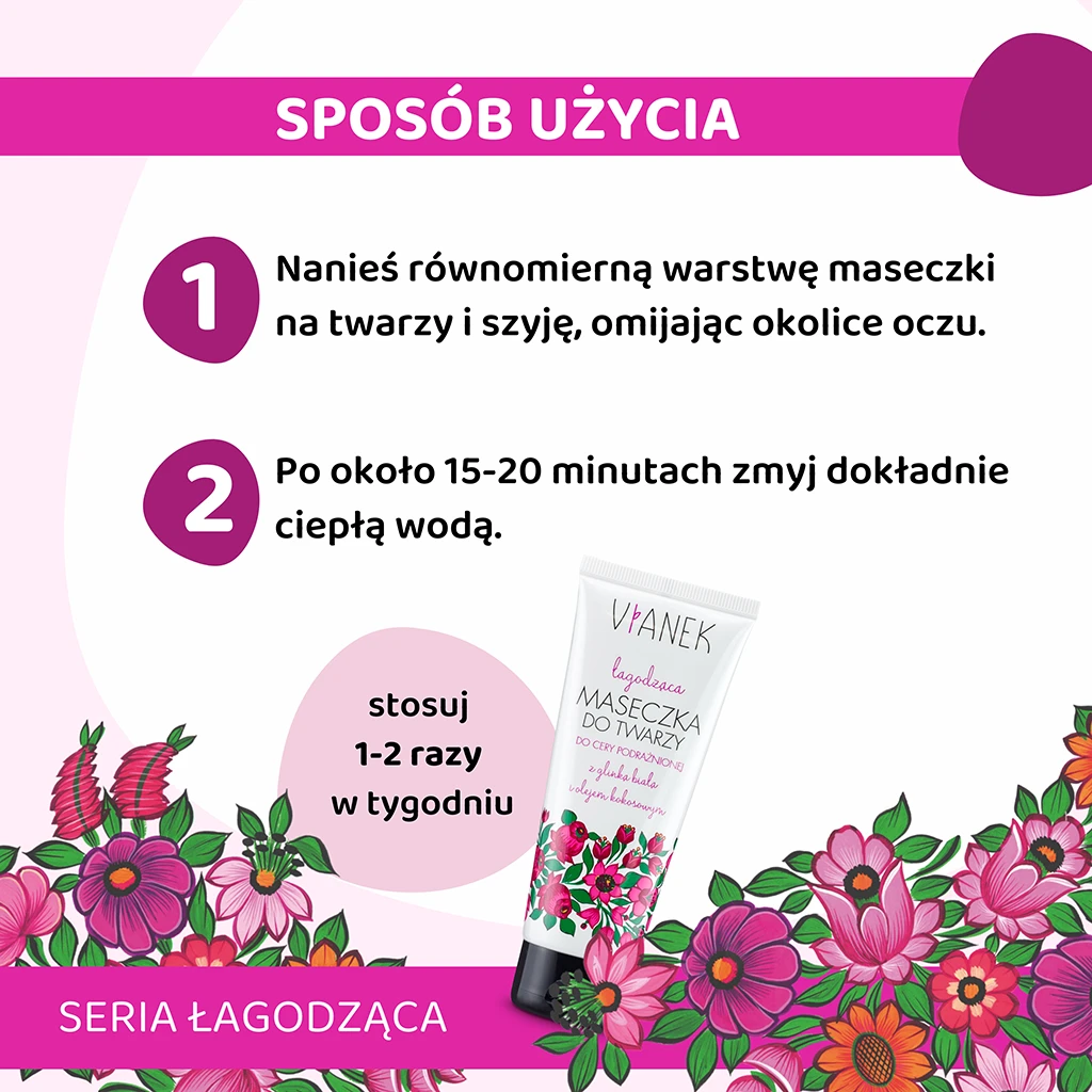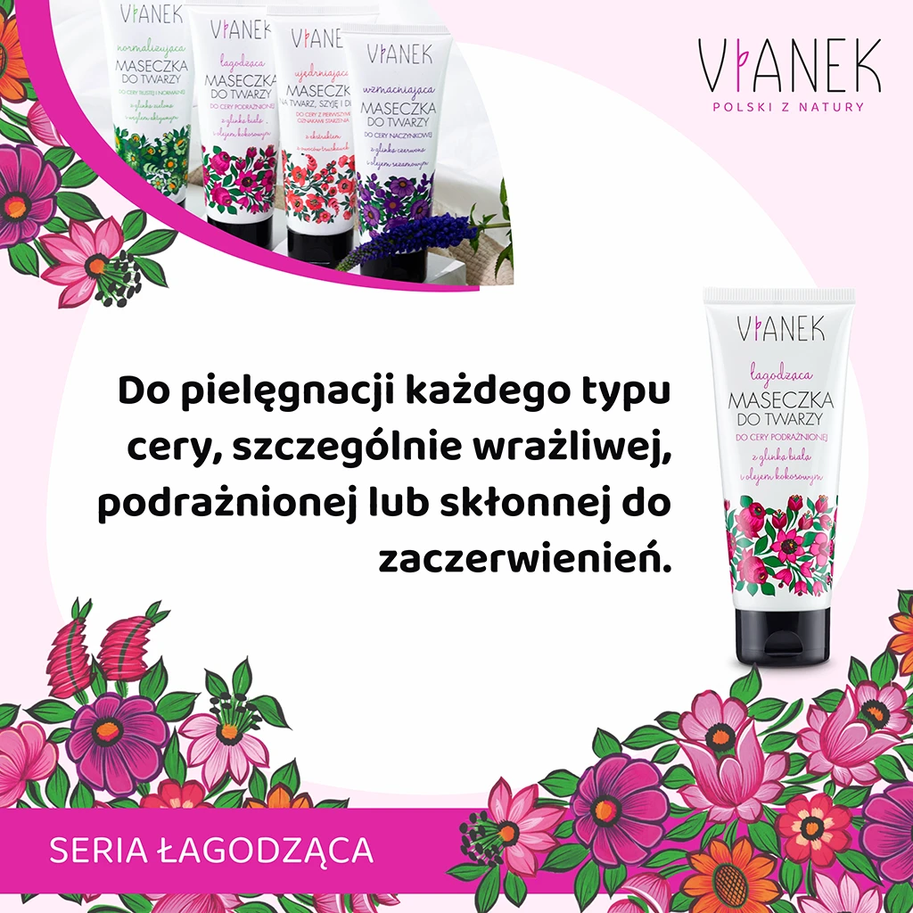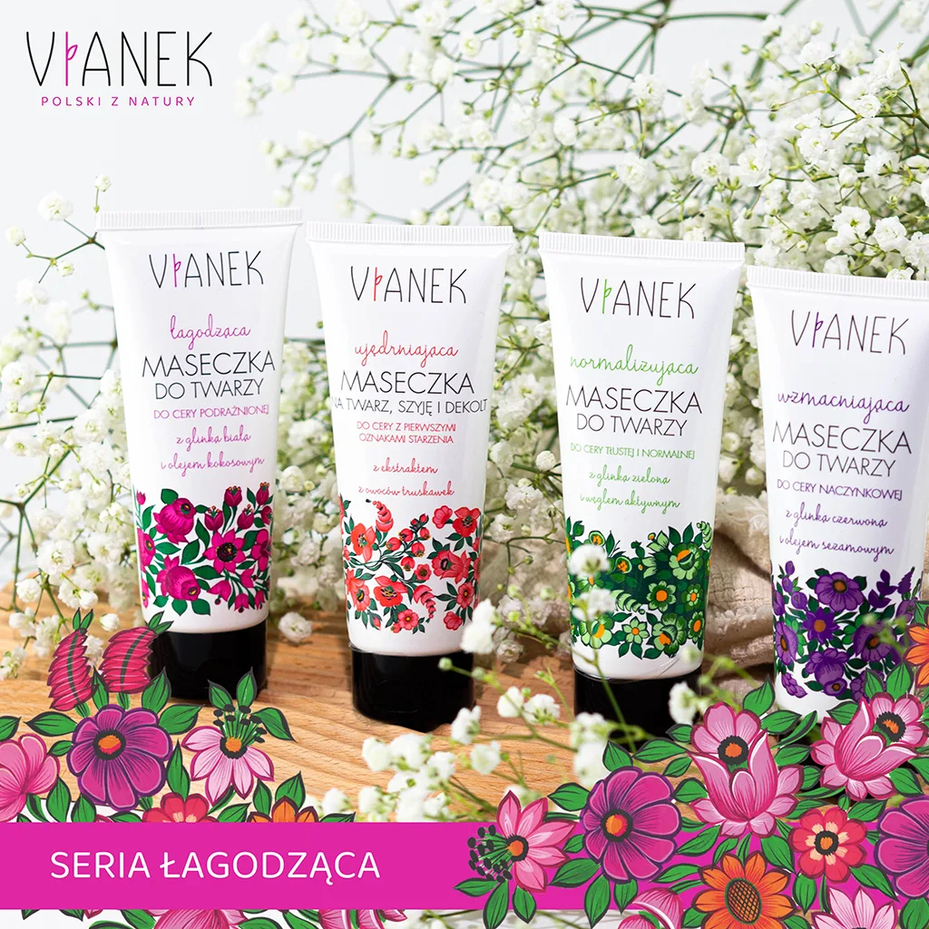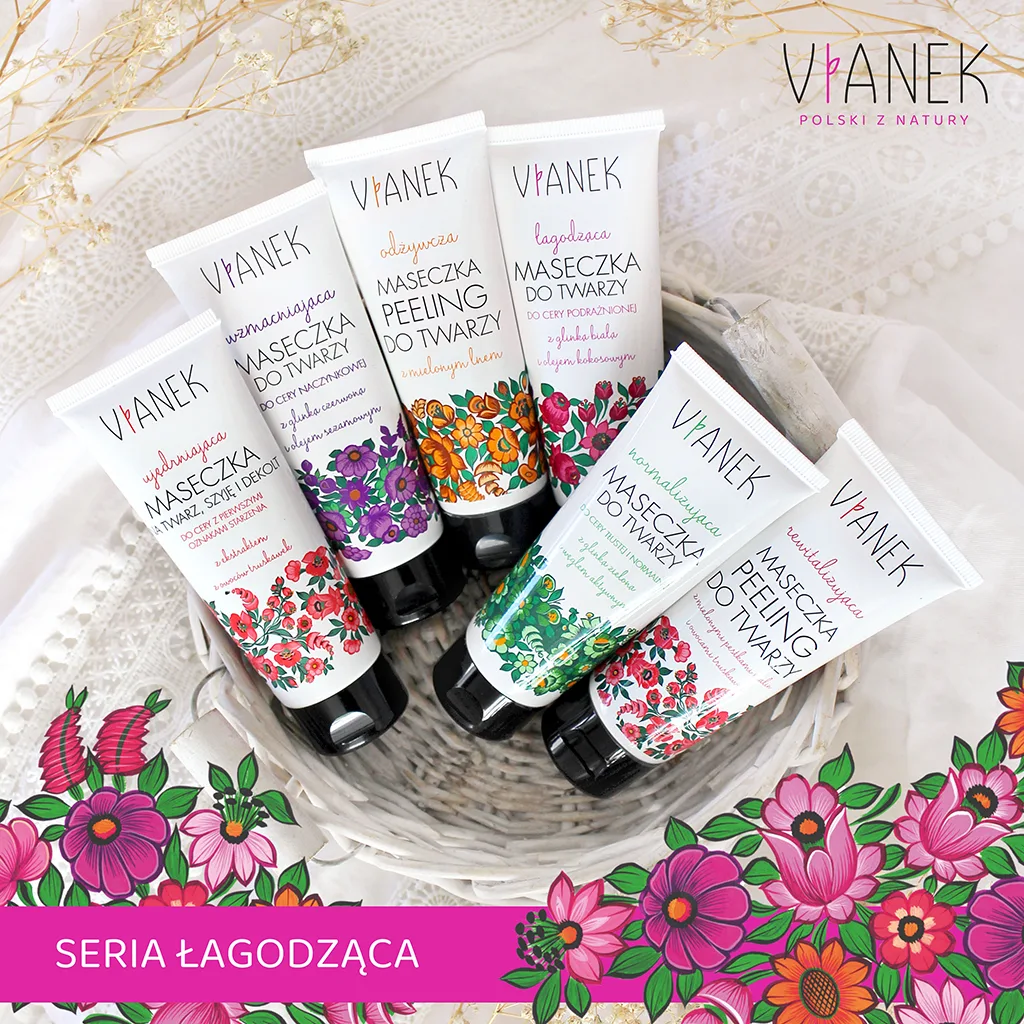 Łagodząca maseczka do twarzy VIANEK zachęca nie tylko swoimi właściwościami pielęgnacyjnymi, ale również delikatnym, kwiatowym aromatem. Stosowanie jej staje się prawdziwą chwilą przyjemności dla ciała i ducha, pozwalając na chwilę oddechu w codziennym zabieganiu.