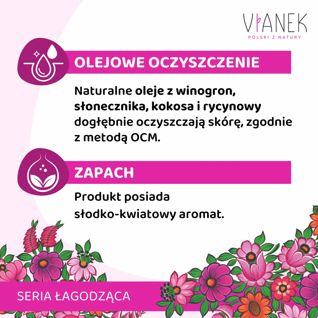 Produkt ten zawiera olejek z rumianku lekarskiego, który jest znanym źródłem związków silnie regenerujących. Rumianek lekarski od wieków był stosowany w pielęgnacji skóry ze względu na właściwości łagodzące i kojące. Dzięki temu, olejek VIANEK doskonale nadaje się do demakijażu wrażliwej lub podrażnionej skóry, a także okolic oka. Jego regularne stosowanie pomoże złagodzić podrażnienia, zredukować uczucie ściągnięcia i suchości, przywracając skórze komfort i równowagę.