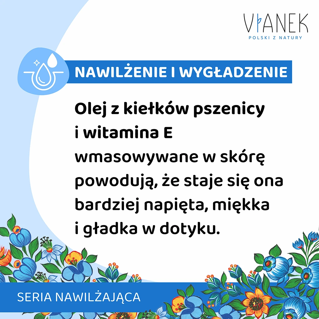 Peeling do ciała VIANEK nie jest tylko produktem złuszczającym. Zawiera także olej z kiełków pszenicy i witaminę E, które są znane ze swoich intensywnych właściwości nawilżających i wygładzających. Wmasowywane w skórę podczas procesu złuszczania, zmiękczają i uelastyczniają. Olej z kiełków pszenicy jest bogatym źródłem antyoksydantów, a witamina E pomaga zachować gładkość skóry. Dzięki temu, skóra po zastosowaniu peelingu staje się nie tylko czystsza, ale także bardziej napięta, miękka i gładka w dotyku.