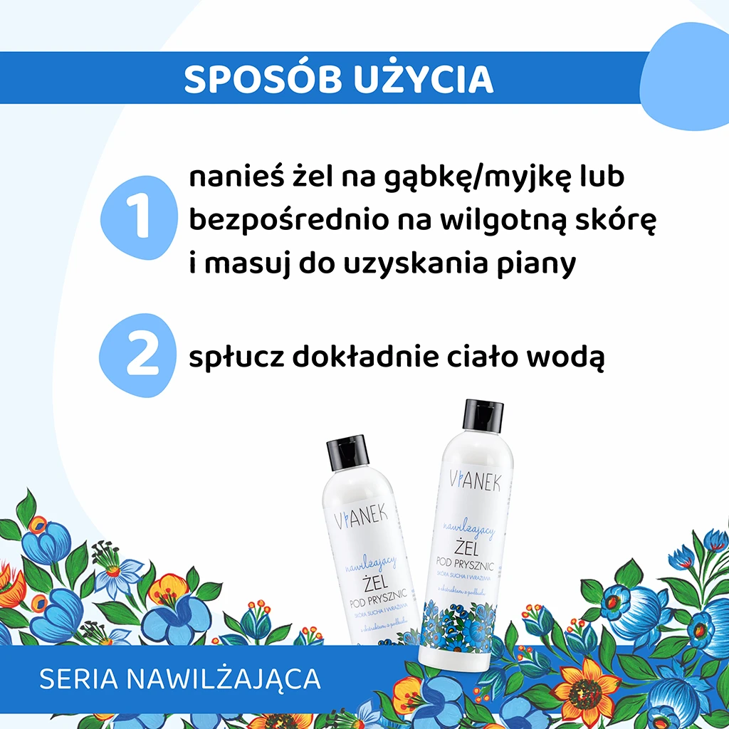 Sposób użycia | Nanieś żel na gąbkę/myjkę lub bezpośrednio na wilgotną skórę i masuj do uzyskania piany. Następnie spłucz dokładnie ciało wodą. |
