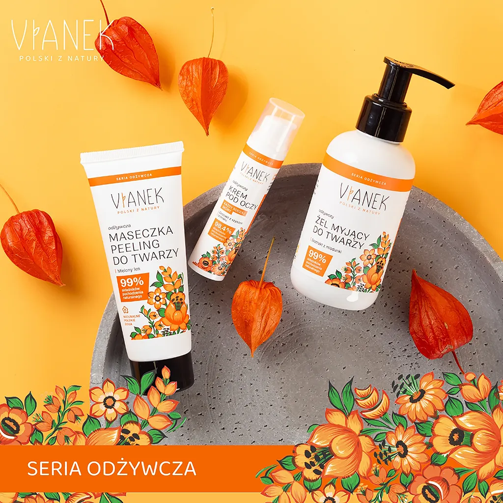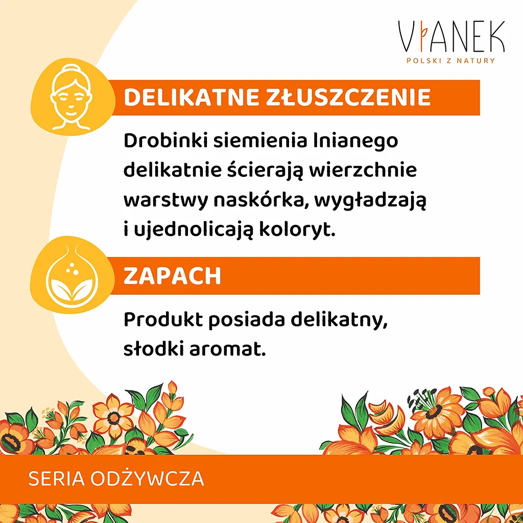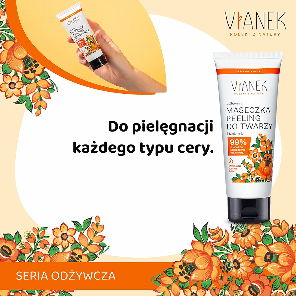 Nasza odżywcza maseczka-peeling VIANEK to doskonały wybór dla każdego typu cery. Produkt skutecznie łączy w sobie dwie kluczowe funkcje – delikatnego peelingu, dzięki drobno zmielonym ziarnom siemienia lnianego, oraz intensywnej odżywczej maseczki.
