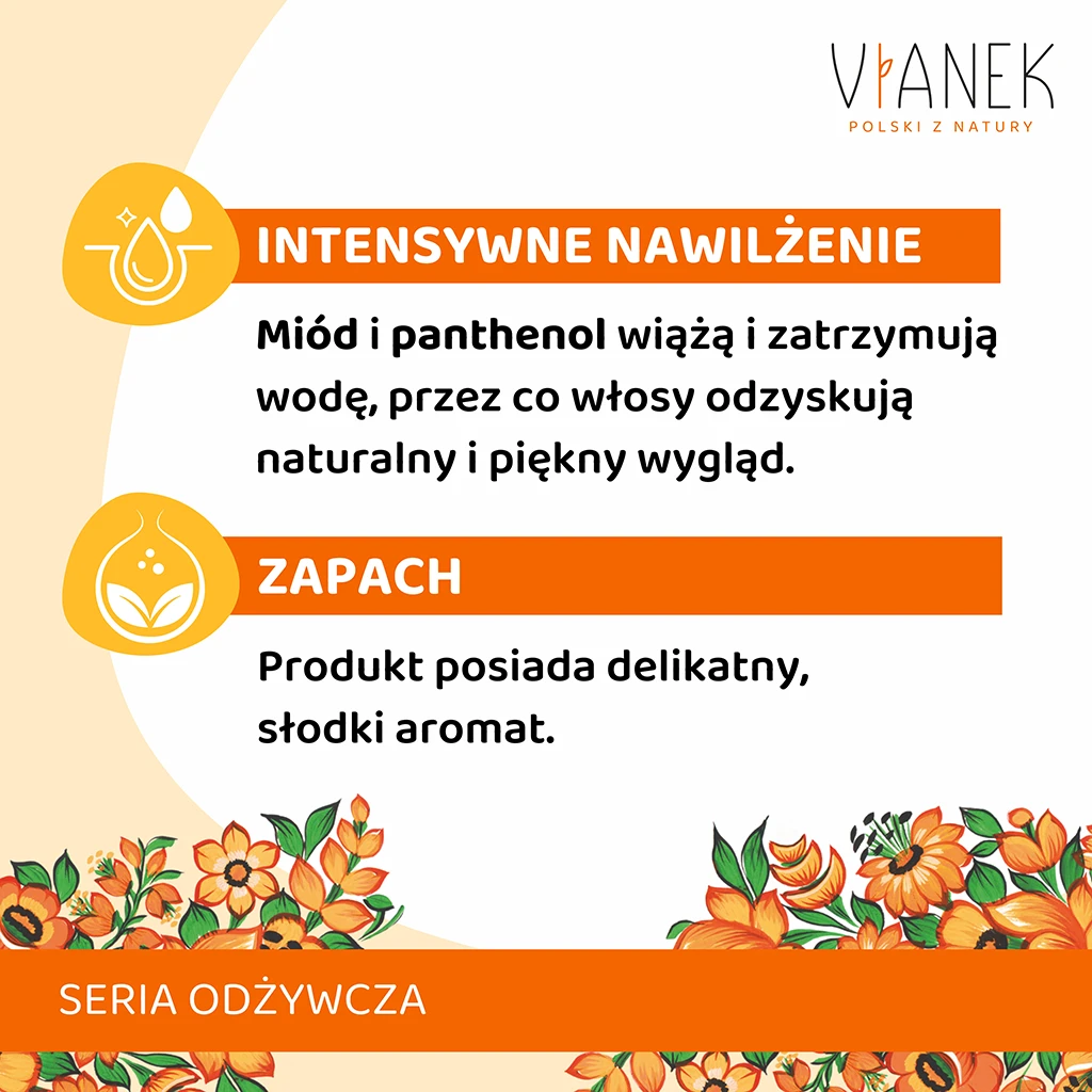 Jeśli masz włosy suche, zniszczone i pozbawione blasku to idealna maska dla Ciebie. Unikalna kompozycja miodu i panthenolu wnika w strukturę włosów, zatrzymując w nich wilgoć. Dzięki temu włosy stają się gładkie, mocne i błyszczące. Maska zapobiega łamaniu się włosów i idealnie wygładza pasma.