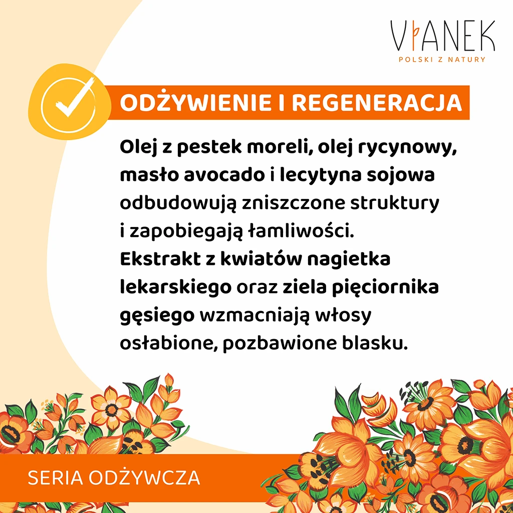 Bogata w składniki odżywcze i regenerujące maska przeznaczona jest do pielęgnacji każdego rodzaju włosów. Zawiera ekstrakt z kwiatów nagietka lekarskiego oraz ziela pięciornika gęsiego, które wzmacniają włosy osłabione i pozbawione blasku. Olej z pestek moreli, olej rycynowy, masło avocado i lecytyna sojowa odbudowują zniszczone struktury oraz zapobiegają łamliwości, idealnie wygładzając pasma. Składniki nawilżające i zatrzymujące wilgoć (miód, panthenol) sprawiają, że po zastosowaniu włosy odzyskują naturalny i piękny wygląd.