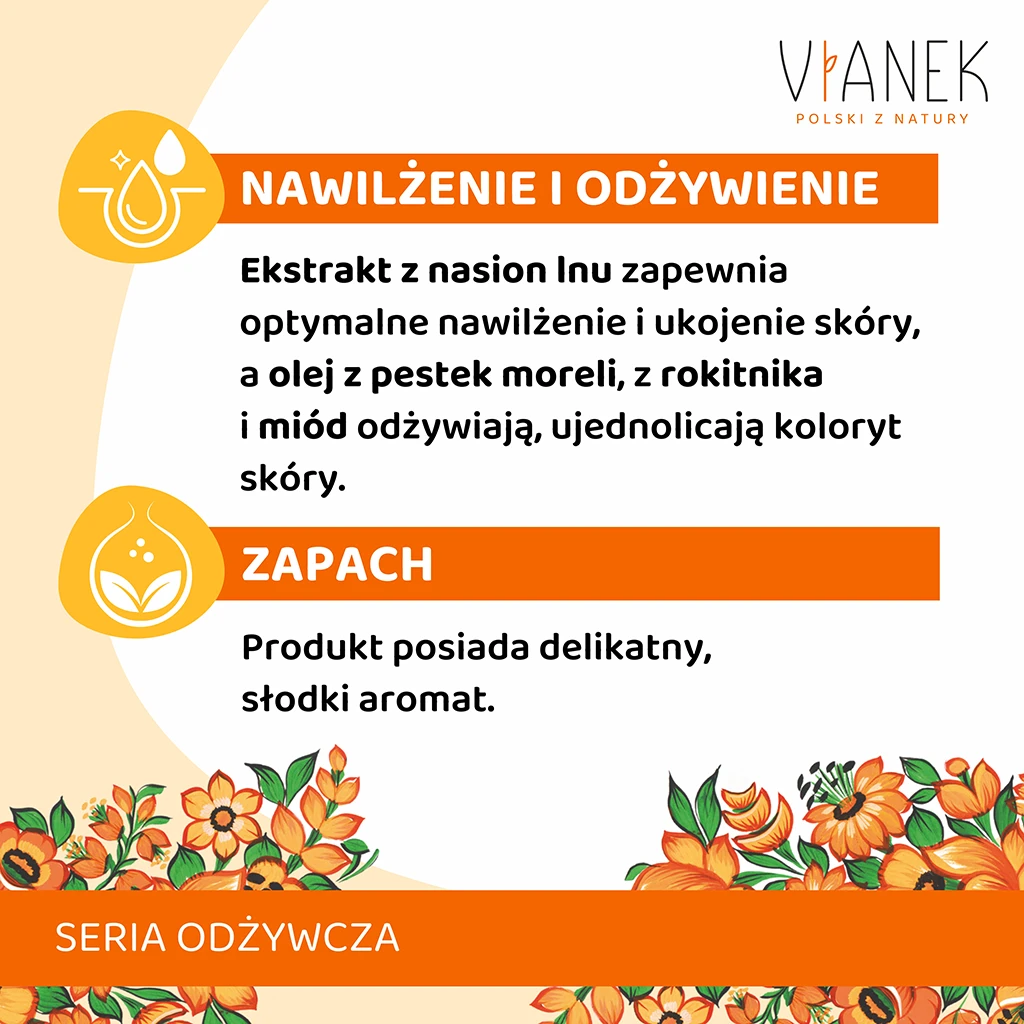 Skład INCI | Aqua, Benzyl Alcohol, Benzyl Salicylate, Cetearyl Alcohol, Cocamidopropyl Betaine, Dehydroacetic Acid, Glycerin, Glycine Soja Oil, Hexyl Cinnamal, Hippophae Rhamnoides Oil, Linum Usitatissimum Seed Extract, Mel Extract, Parfum, Prunus Armeniaca Kernel Oil, Sorbitan Stearate, Sucrose Cocoate, Tocopheryl Acetate |