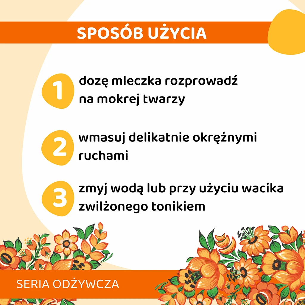 Odżywcze mleczko do demakijażu sprawdzi się w pielęgnacji każdego typu cery. Doskonale radzi sobie z usuwaniem zanieczyszczeń z twarzy, oczu, i ust bez ryzyka przesuszenia skóry. Zawiera olej z pestek moreli i olej rokitnikowy, które są znane z właściwości odżywczych, oraz miód, słynący ze swoich właściwości nawilżających i łagodzących. Dodatkowo, ekstrakt z nasion lnu wzmacnia działanie nawilżające i kojące, zapewniając skórze optymalny poziom nawilżenia. Stosowanie tego mleczka pozwala na dokładne oczyszczenie skóry, pozostawiając ją czystą i gładką. Wyrównuje także koloryt skóry i zabezpiecza przed negatywnym wpływem czynników zewnętrznych.