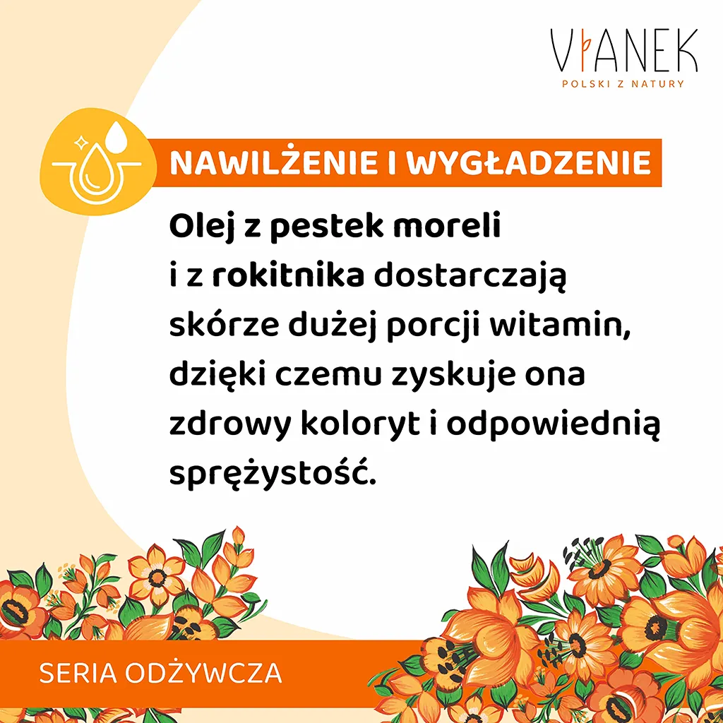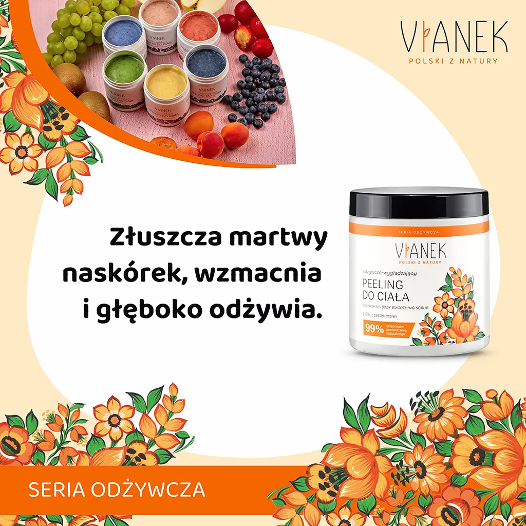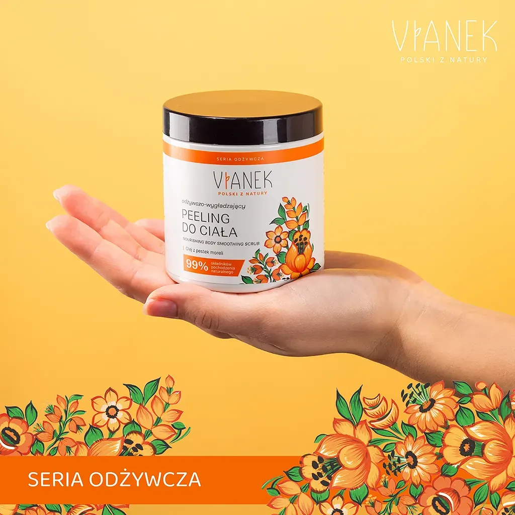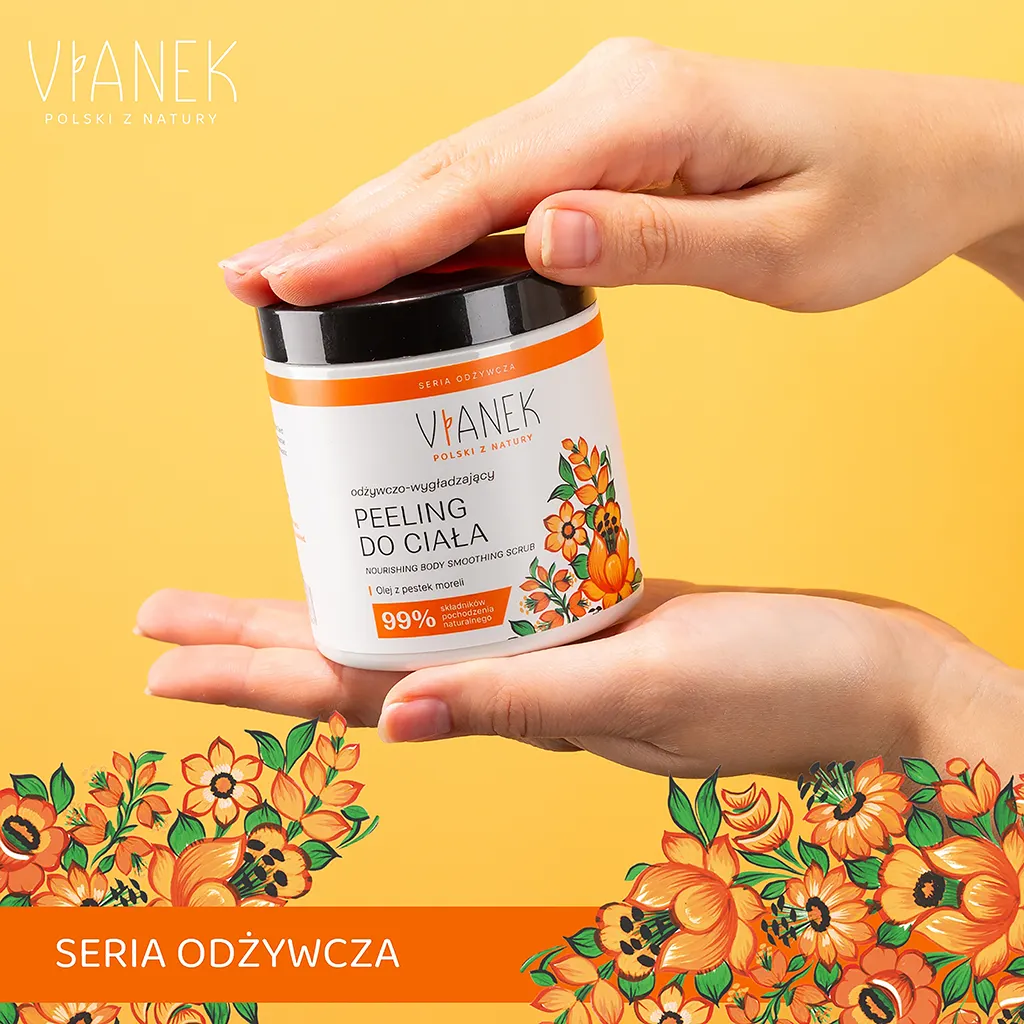 Odżywczo-wygładzający peeling do ciała VIANEK wykorzystuje moc natury w postaci cennego oleju z pestek moreli oraz rokitnika. To prawdziwa bomba witaminowa, która dostarcza Twojej skórze niezbędnych składników odżywczych. Peeling wyrównuje koloryt skóry, sprawia, że staje się elastyczna, sprężysta i promienna.