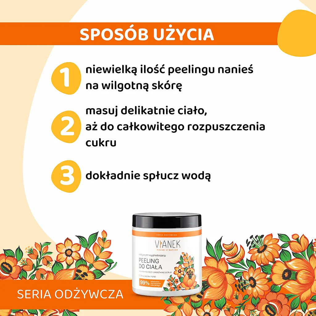 Sposób użycia | Niewielką ilość peelingu nanieś na wilgotną skórę i delikatnie masuj ciało, aż do całkowitego rozpuszczenia cukru. Następnie spłucz wodą. Stosuj 1-2 razy w tygodniu. |