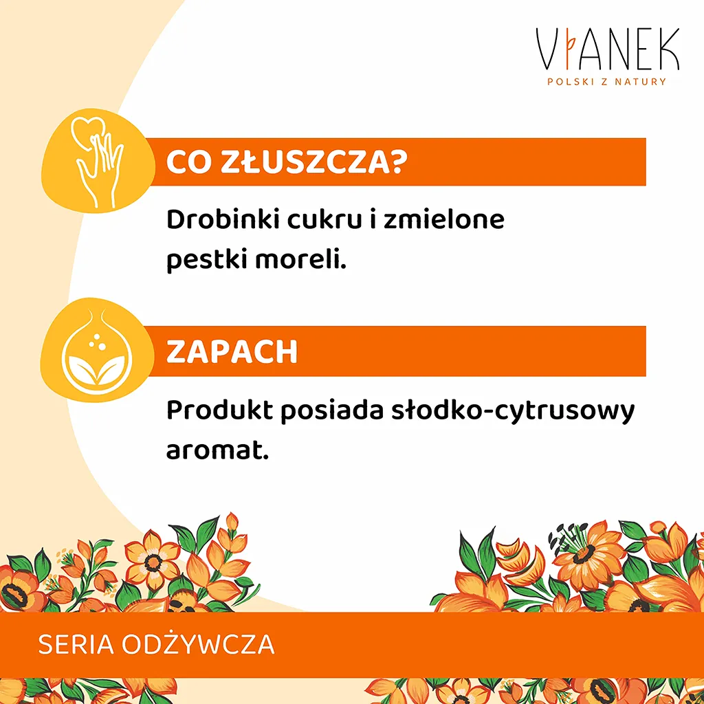 Jakbym mogła to bym go zjadła łyżeczką. Jeszcze nigdy nie spotkałam tak naturalnego zapachu w produkcie. Jest bardzo intensywny i przypomina mi zapach moreli, które mama dawała mi do jedzenia jak byłam mała. Peeling jest gruboziarnisty i oleisty, zostawia warstwę ochronną na skórze. Zauważyłam, że już po kilku użyciach moje ciało jest wygładzone, miękkie i cudownie zadbane, przez kosmetyk, a do tego otulone obledny zapachem, który pozostaje na skórze długo. Czuję się świeżo, czuję się piękna. Produkt jest bardzo wydajny i ma łatwa aplikację. Apsolutnie nie uczula i nie wysusza skóry nawet tej wrażliwej, która osobiście posiadam. Uwierz, że natura czyni cuda, uwierz w Vianek wersję odżywcza z pestkami moreli. Bardzo polecam, fanka????