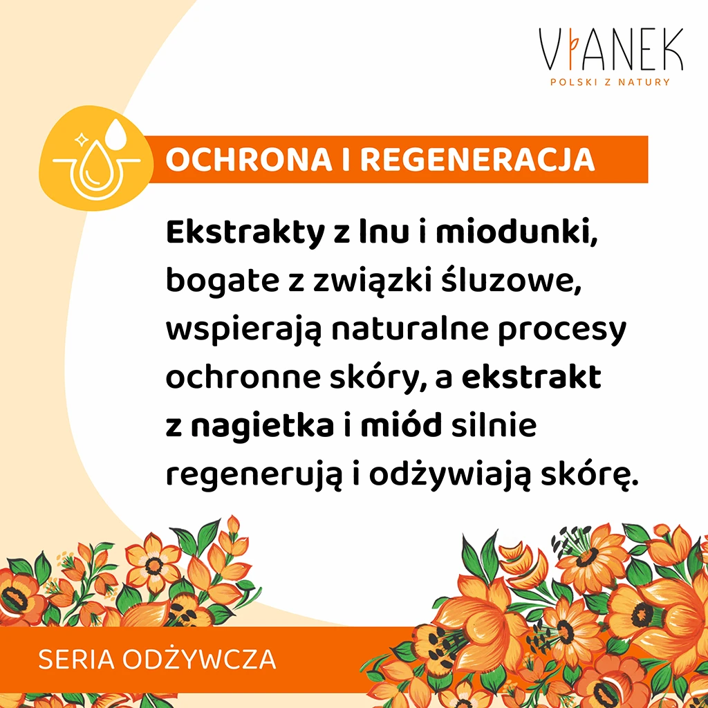 Ekstrakty z lnu i miodunki, bogate w związki śluzowe, działają jak tarcza ochronna dla skóry. Dodatkowo, wyjątkowe połączenie ekstraktu z nagietka i odżywczego miodu silnie regeneruje skórę, sprawiając, że staje się jędrna, odżywiona i pełna blasku.