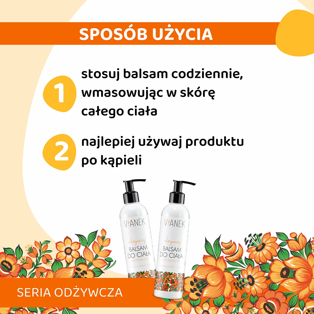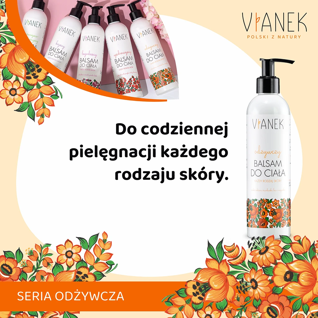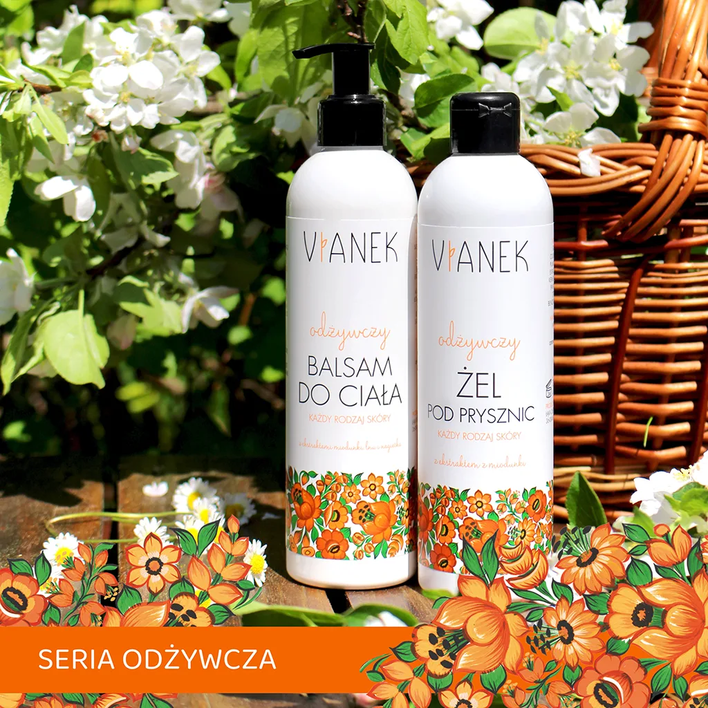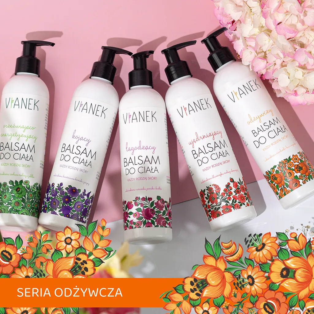 Odżywczy balsam do ciała VIANEK powstał z myślą o codziennej pielęgnacji każdego typu skóry. Jego naturalne składniki pomagają zadbać o odpowiednie nawilżenie i odżywienie skóry całego ciała. Regularne stosowanie wzmacnia skórę, sprawiając, że staje się bardziej sprężysta i promienna.
