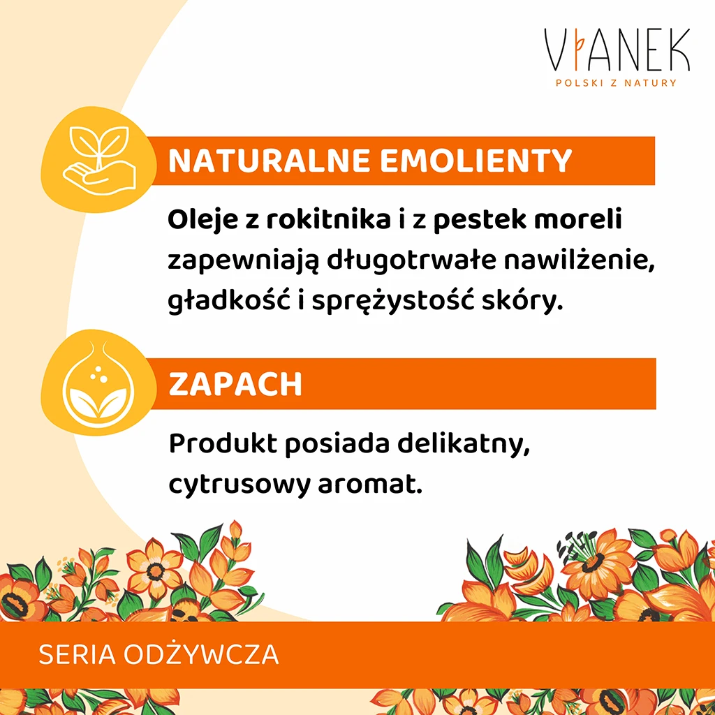 Nasz balsam wzbogacony jest naturalnymi emolientami – olejem z rokitnika i z pestek moreli. Te wyjątkowe składniki nie tylko dostarczą Twojej skórze intensywnego nawilżenia, ale także uczynią ją gładką i elastyczną na długi czas.