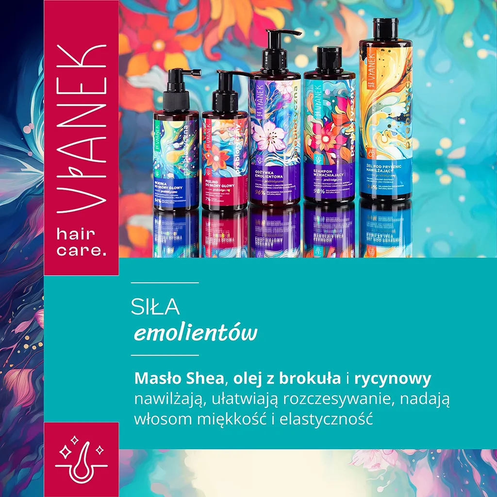 Odkryj sekret głęboko nawilżonych i silnych włosów z naszą Prebiotyczną odżywką emolientową, stworzoną do pielęgnacji każdego rodzaju włosów, szczególnie suchych, osłabionych i skłonnych do wypadania. Jej innowacyjna formuła łączy działanie prebiotyków z mocą naturalnych emolientów, aby zapewnić Twoim włosom optymalną ochronę, nawilżenie i wzmocnienie.