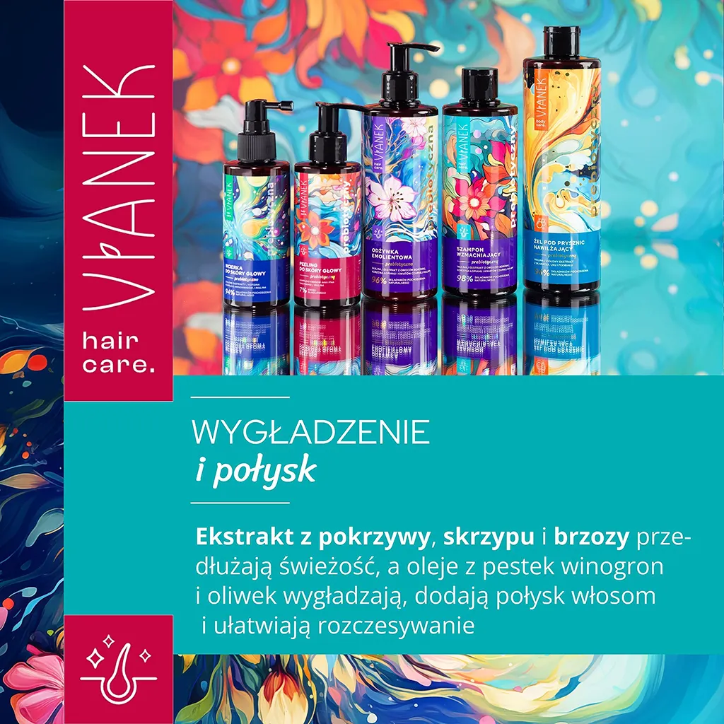 Naturalne ekstrakty z pokrzywy, skrzypu i brzozy w połączeniu z olejami z pestek winogron i oliwek przedłużają świeżość włosów, wygładzają je i ułatwiają rozczesywanie, sprawiając, że stają się niezwykle lśniące i gładkie. Lekka, świeża kompozycja zapachowa sprawia, że każde użycie odżywki jest prawdziwą przyjemnością, a przyjemny zapach na długo utrzymuje się na włosach.