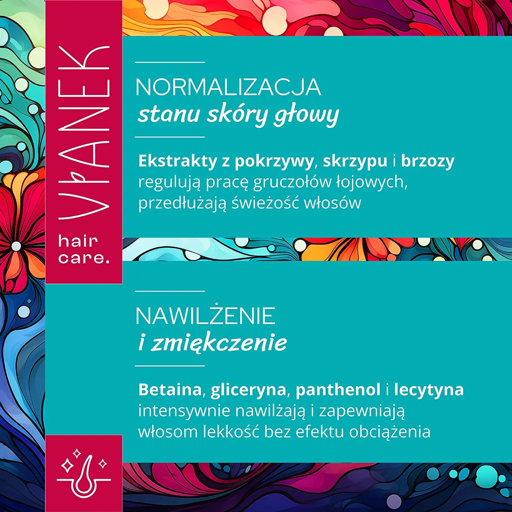 Szampon oczyszczający z linii VIANEK Prebiotyczny sprawdzi się do każdego rodzaju włosów, zwłaszcza przetłuszczających się. Dzięki zawartości ekstraktów z pokrzywy, skrzypu i brzozy reguluje pracę gruczołów łojowych, przedłużając uczucie świeżości i czystości włosów.