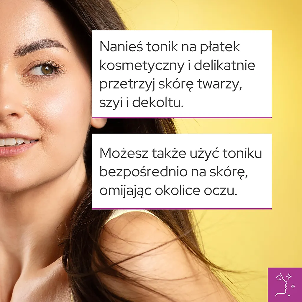 Nanieś tonik na płatek kosmetyczny i delikatnie przetrzyj skórę twarzy, szyi i dekoltu. Możesz także użyć toniku bezpośrednio na skórę, omijając okolice oczu.