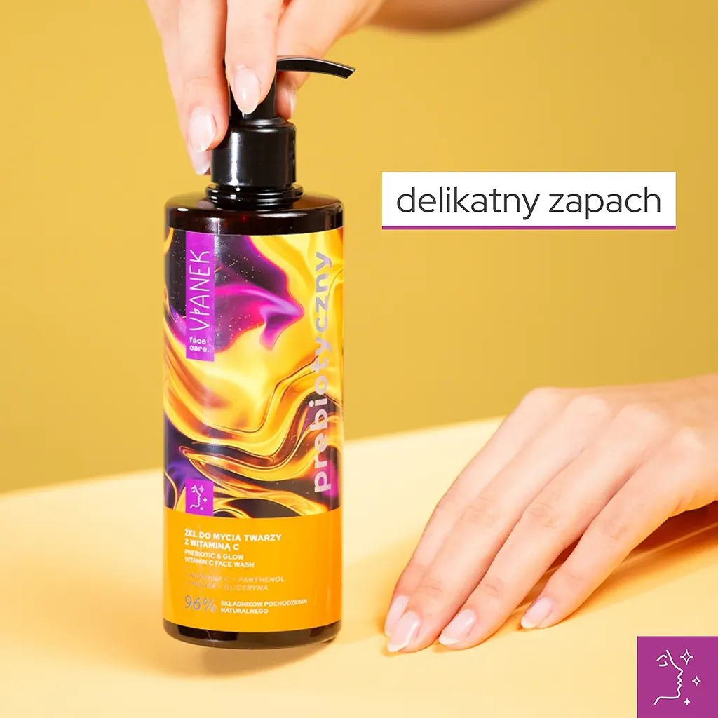 Prebiotyczny żel do mycia twarzy z witaminą C do oczyszczania każdego rodzaju cery, szczególnie wymagającej wygładzenia i rozświetlenia. Delikatnie, ale skutecznie oczyszcza, poprawiając przy tym elastyczność skóry, wyrównując jej koloryt i dodając blasku.