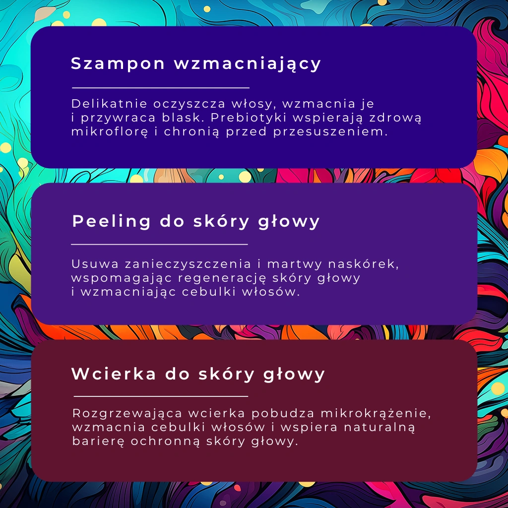 Produkty z zestawu działają w synergii, tworząc kompletny rytuał pielęgnacyjny. Szampon wzmacniający delikatnie oczyszcza włosy i skórę głowy, przywracając im miękkość i blask. Peeling usuwa martwy naskórek i zanieczyszczenia, wspierając regenerację i przygotowując skórę do dalszej pielęgnacji. Wcierka rozgrzewa i pobudza mikrokrążenie, wspomagając wzrost włosów i wzmacniając cebulki.