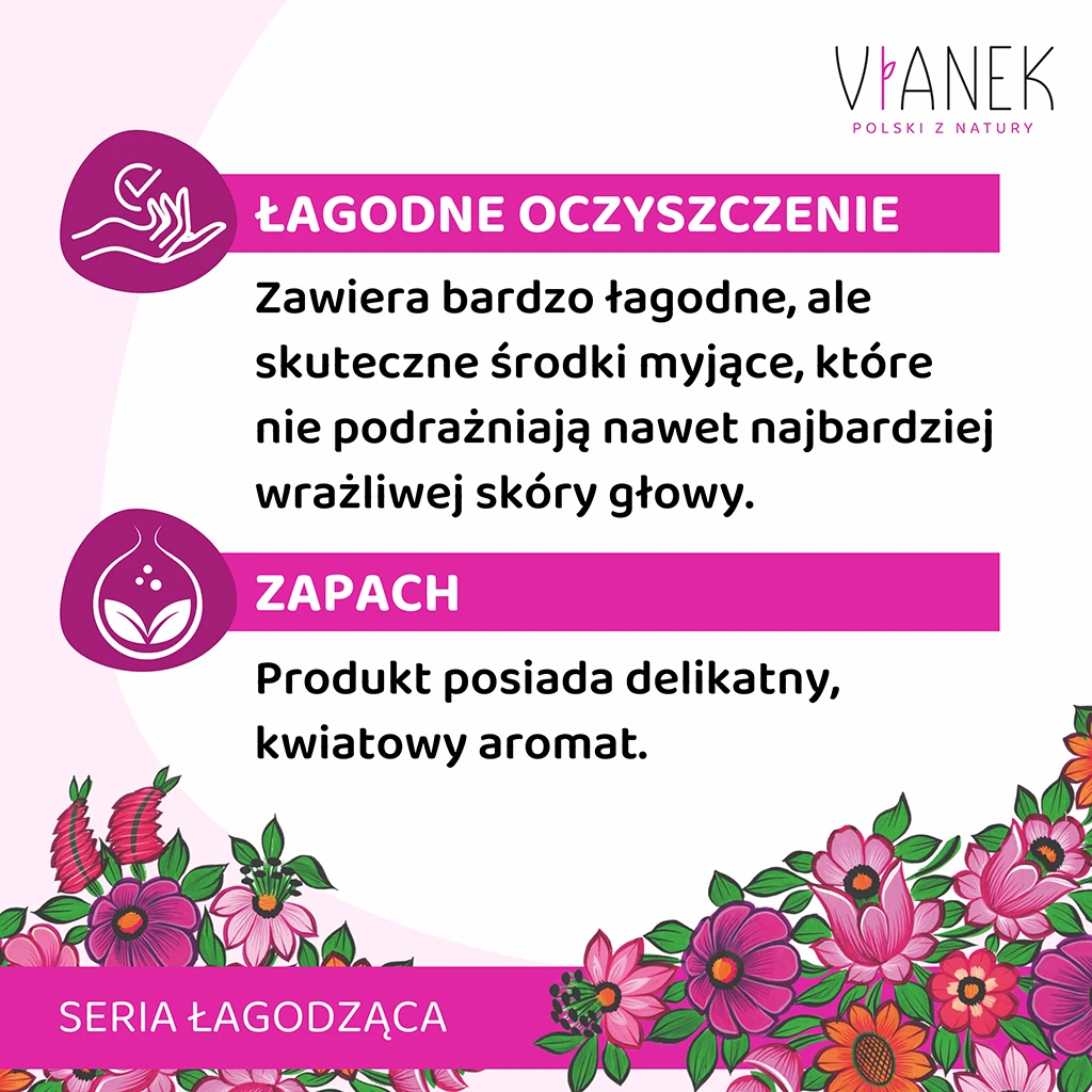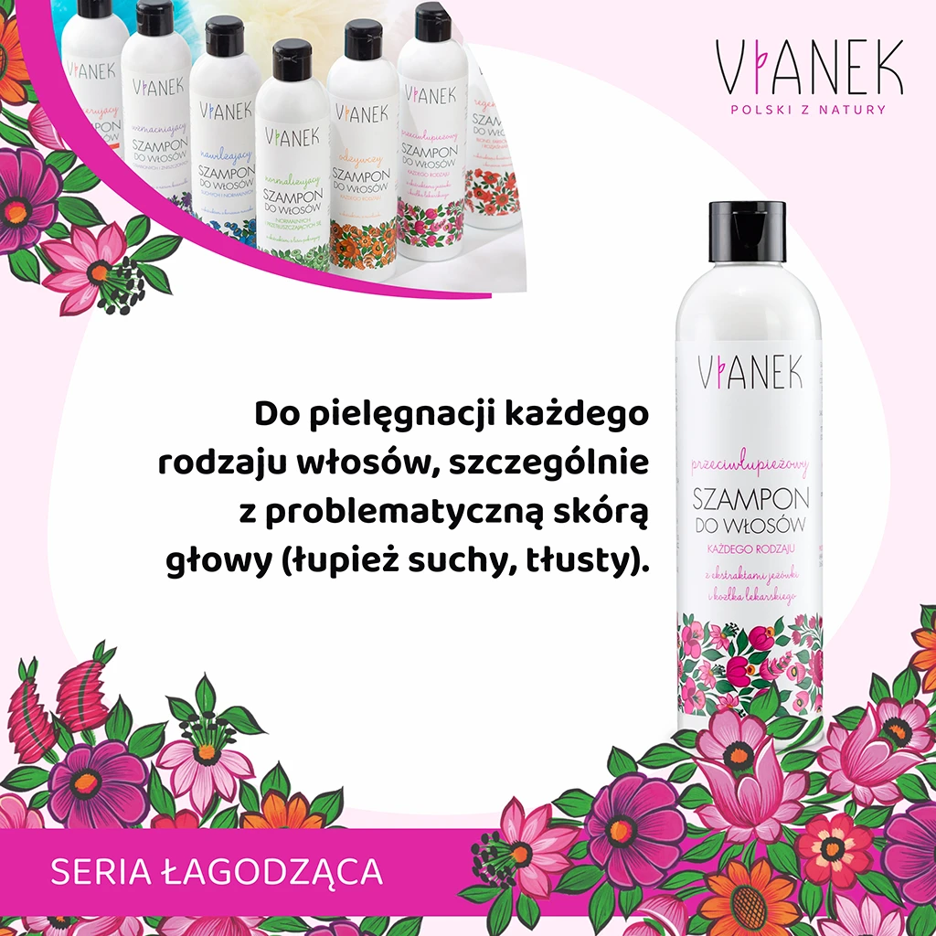 Przeciwłupieżowy szampon do włosów VIANEK został stworzony z myślą o osobach borykających się z problemem łupieżu, zarówno suchego, jak i tłustego. Przeznaczony dla tych, którzy mają trudności z utrzymaniem równowagi skóry głowy, często manifestującej się poprzez nadmierne łuszczenie się naskórka.