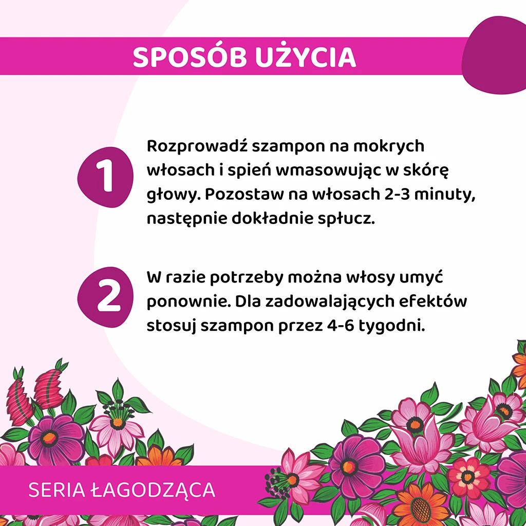Rozprowadź szampon na mokrych włosach i spień wmasowując w skórę głowy. Pozostaw na włosach 2-3 minuty, następnie dokładnie spłucz. W razie potrzeby można włosy umyć ponownie. Dla zadowalających efektów stosuj szampon przez 4-6 tygodni.