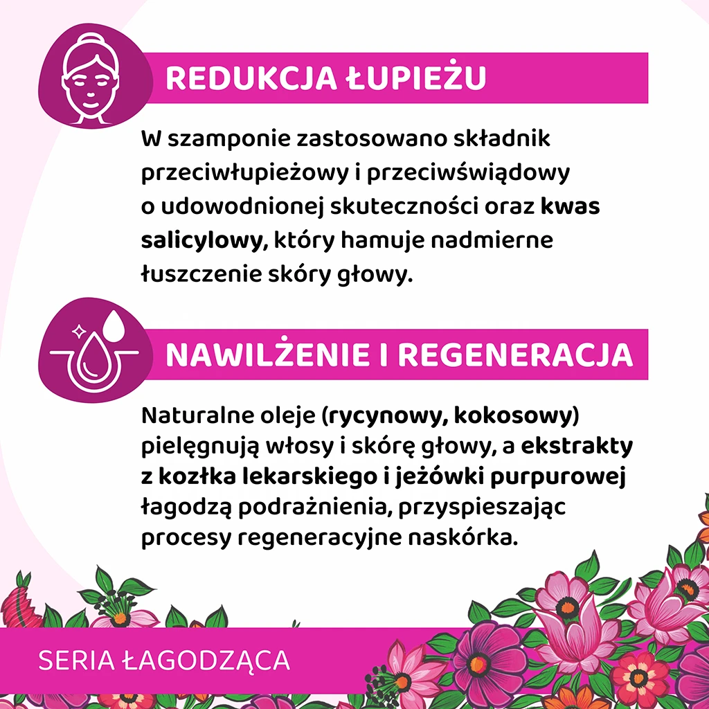 Niezwykle delikatny kosmetyk myjący do włosów, który łączy w sobie właściwości szamponu i odżywki. Zawiera składnik przeciwłupieżowy o udowodnionej skuteczności. Pomaga zlikwidować zarówno łupież tłusty, jak i suchy, wspomagając naturalne funkcje ochronne skóry. Ekstrakty z jeżówki i waleriany łagodzą podrażnienia, przyspieszając procesy regeneracji naskórka. Dodatek kwasu salicylowego pozwala zmniejszyć nadmierne łuszczenie skóry głowy. Po zastosowaniu szamponu włosy są dobrze oczyszczone, a skóra głowy odświeżona.